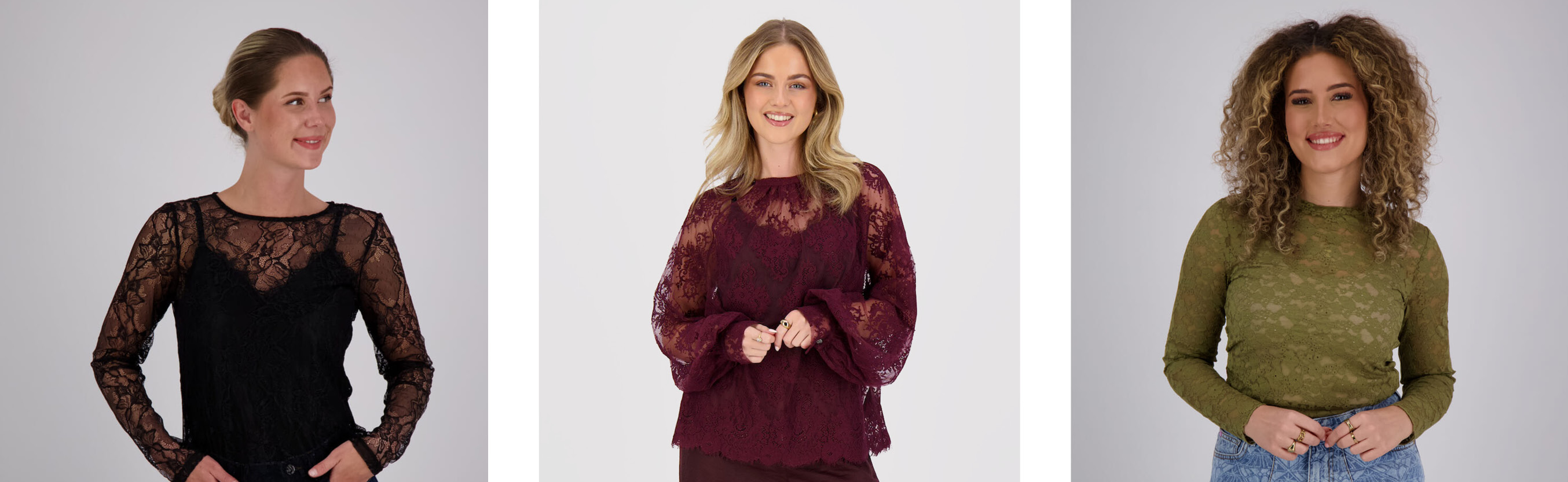 Hoewel wit en zwart altijd populair blijven, zien we dit seizoen veel meer kleur binnen de kanttrend. Zachte pasteltinten zoals poederroze en lichtgroen geven een frisse, elegante uitstraling, terwijl warmere tinten zoals terracotta, bordeaux en nachtblauw zorgen voor een chique en luxe look. Deze kleuren maken kant toegankelijk voor verschillende stijlen en smaken. Door te kiezen voor kleur geef je je outfit net wat meer persoonlijkheid en kun je kant op een eigentijdse manier in je garderobe verwerken.