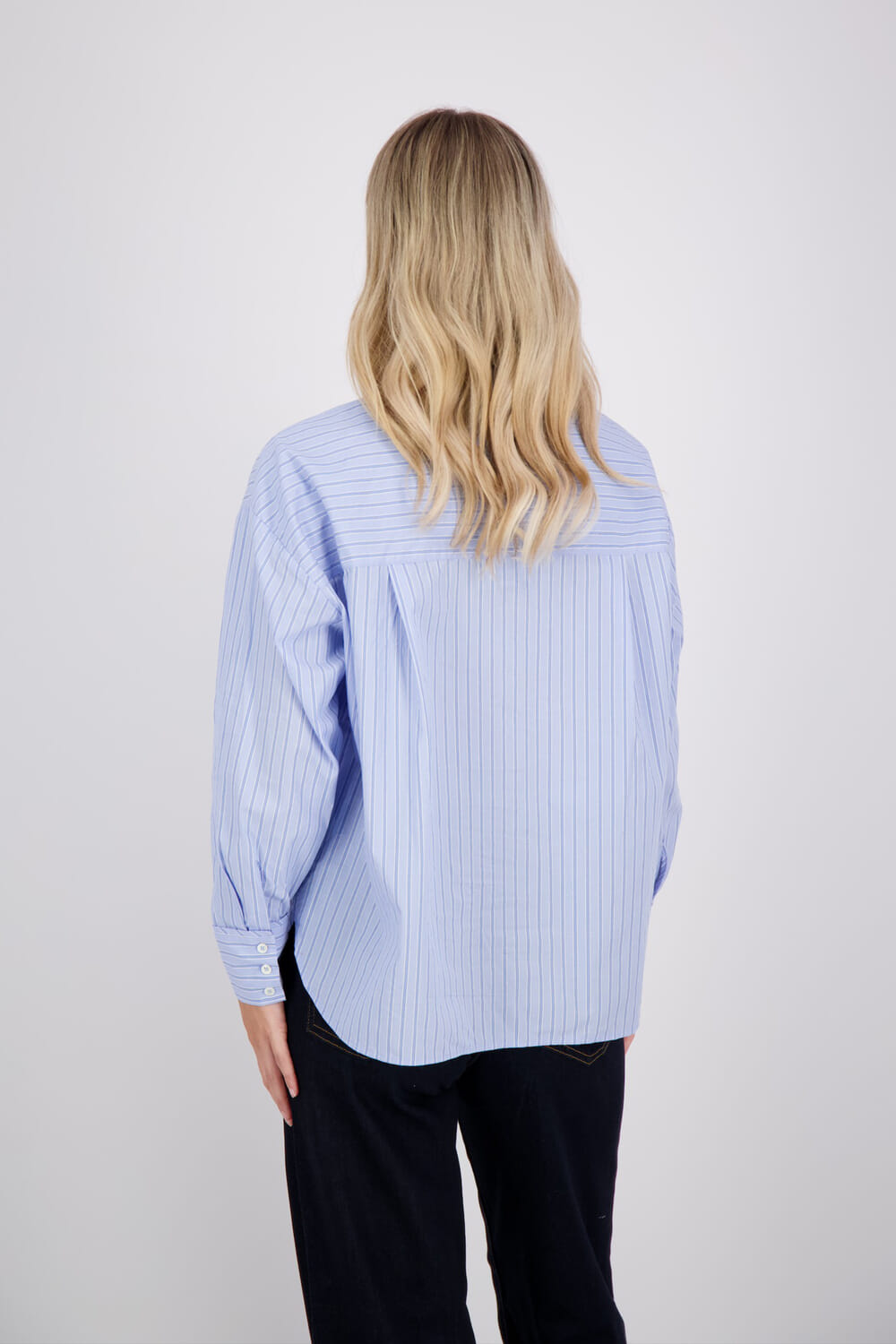 Blouse Jody van JC Sophie is een stijlvolle dames blouse met een losse pasvorm, lange mouwen en een strik kraag. De manchetten hebben knopen en de stof heeft een elegant streep patroon. Ideaal voor een modieuze, vrouwelijke uitstraling.