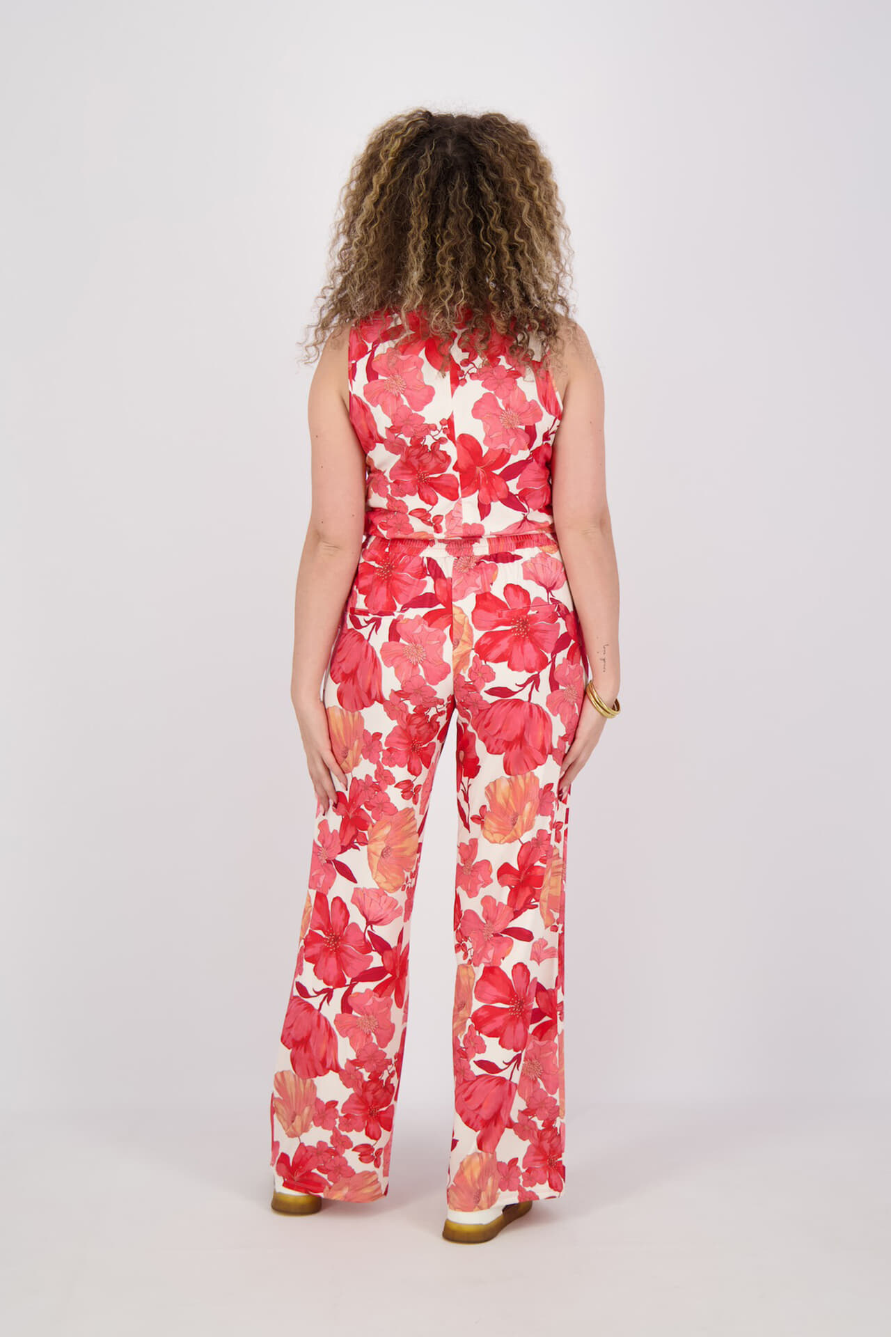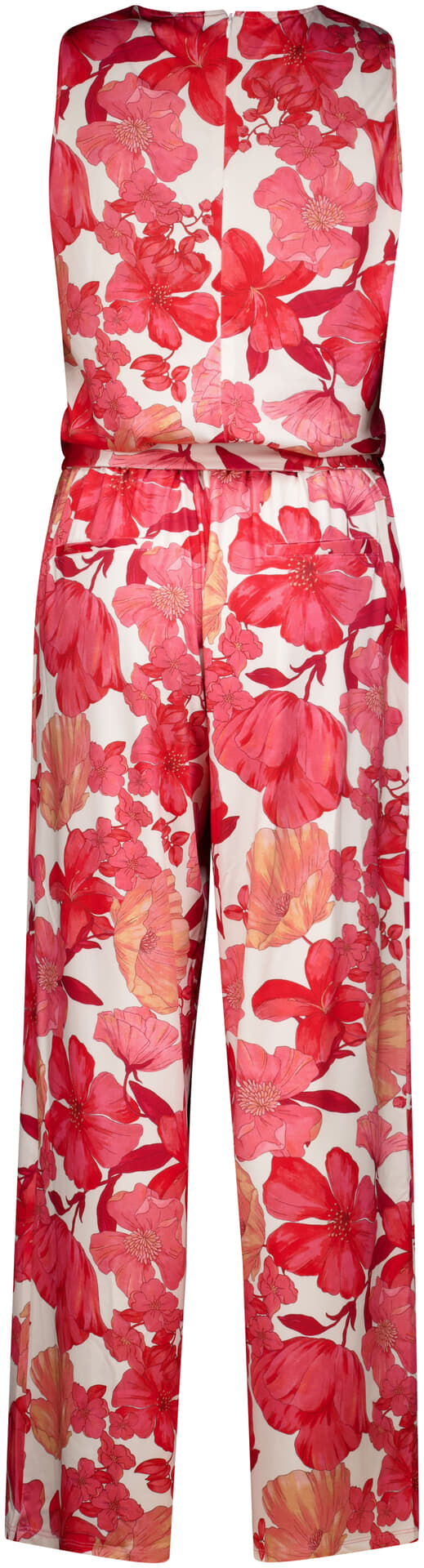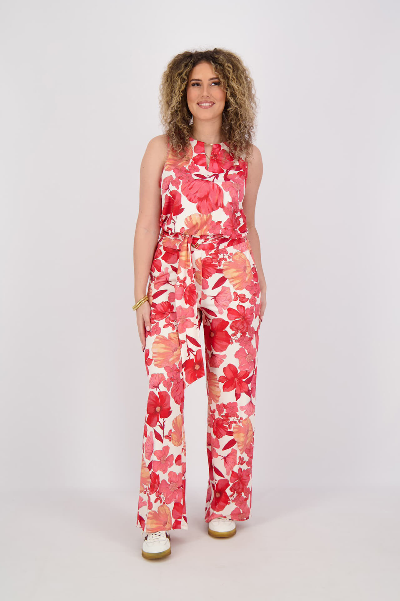 Jumpsuit van K Design, jumpsuit met ronde hals en mouwloos model, bloemenprint in roodtinten, normale taille met strikceintuur, knoop- en ritssluiting, zakken voor, en soepel vallende, rechte pijpen. Geschikt voor casual momenten en feestelijke gelegenheden.