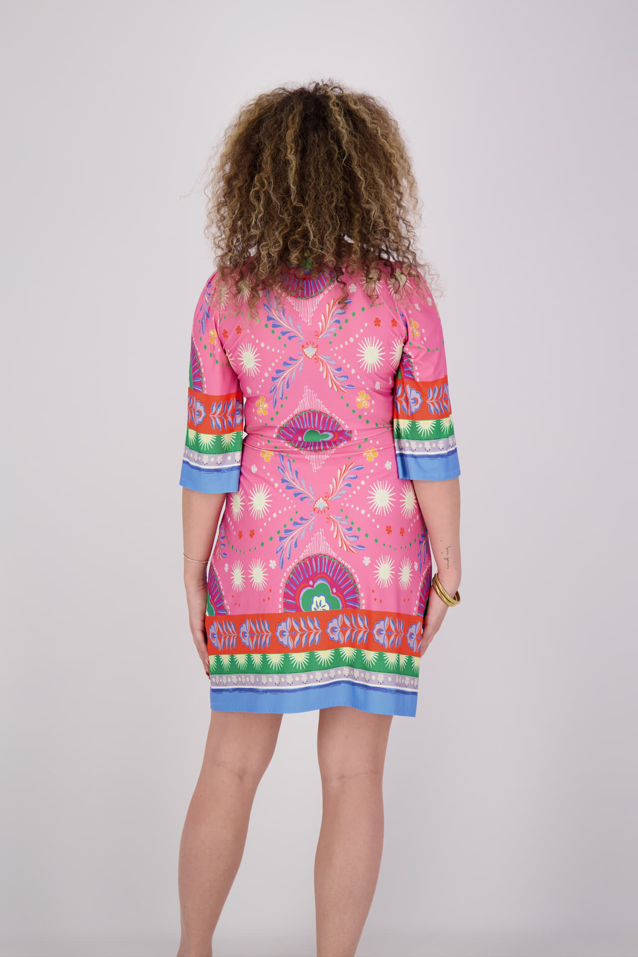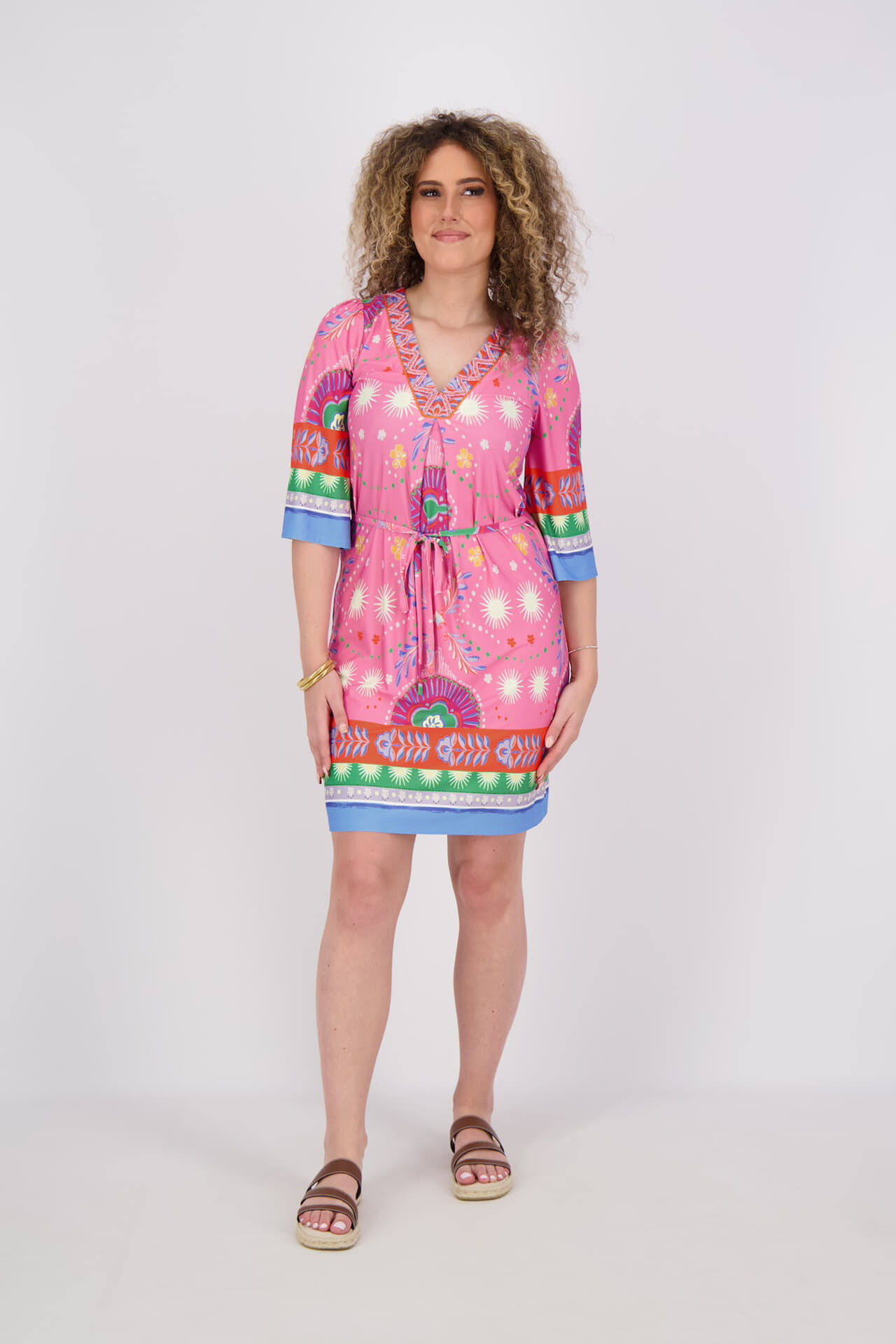 Jurk van K Design met bohemian, casual uitstraling, all-over bloemenprint, V-hals met sierband, 3/4 mouwen en mini rok. De koordsluiting met strikceintuur accentueert de taille, terwijl contrasterende boorddetails en een soepele stof het geheel geschikt maken voor casual, trendy momenten.