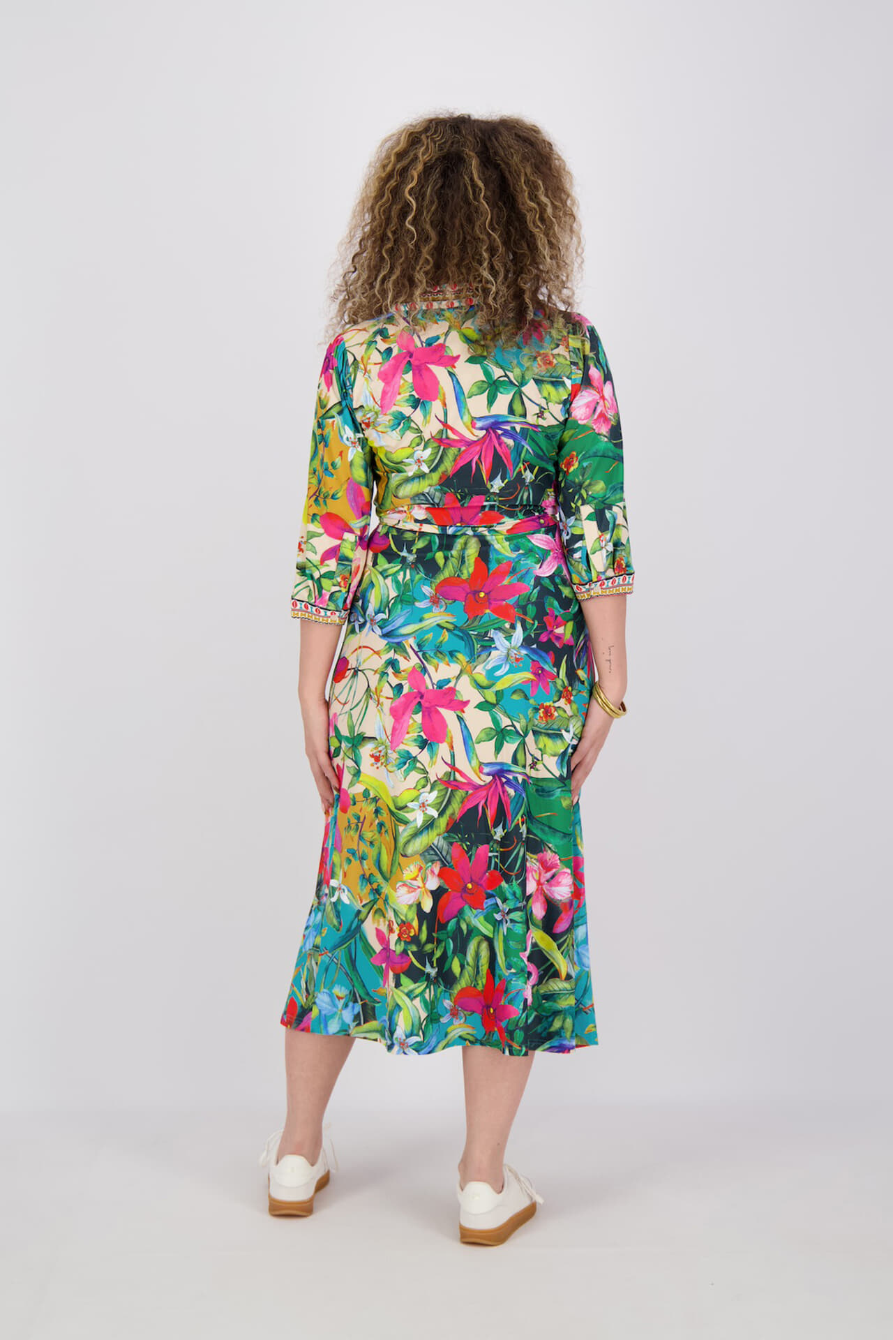 De jurk van K Design, een dames jurken, straalt een bohemian stijl uit met een levendig bloemenpatroon. Het heeft driekwart mouwen en een elegante midi-lengte, perfect voor een frisse uitstraling. Dit kledingstuk biedt comfort en stijl in één, ideaal voor diverse gelegenheden.