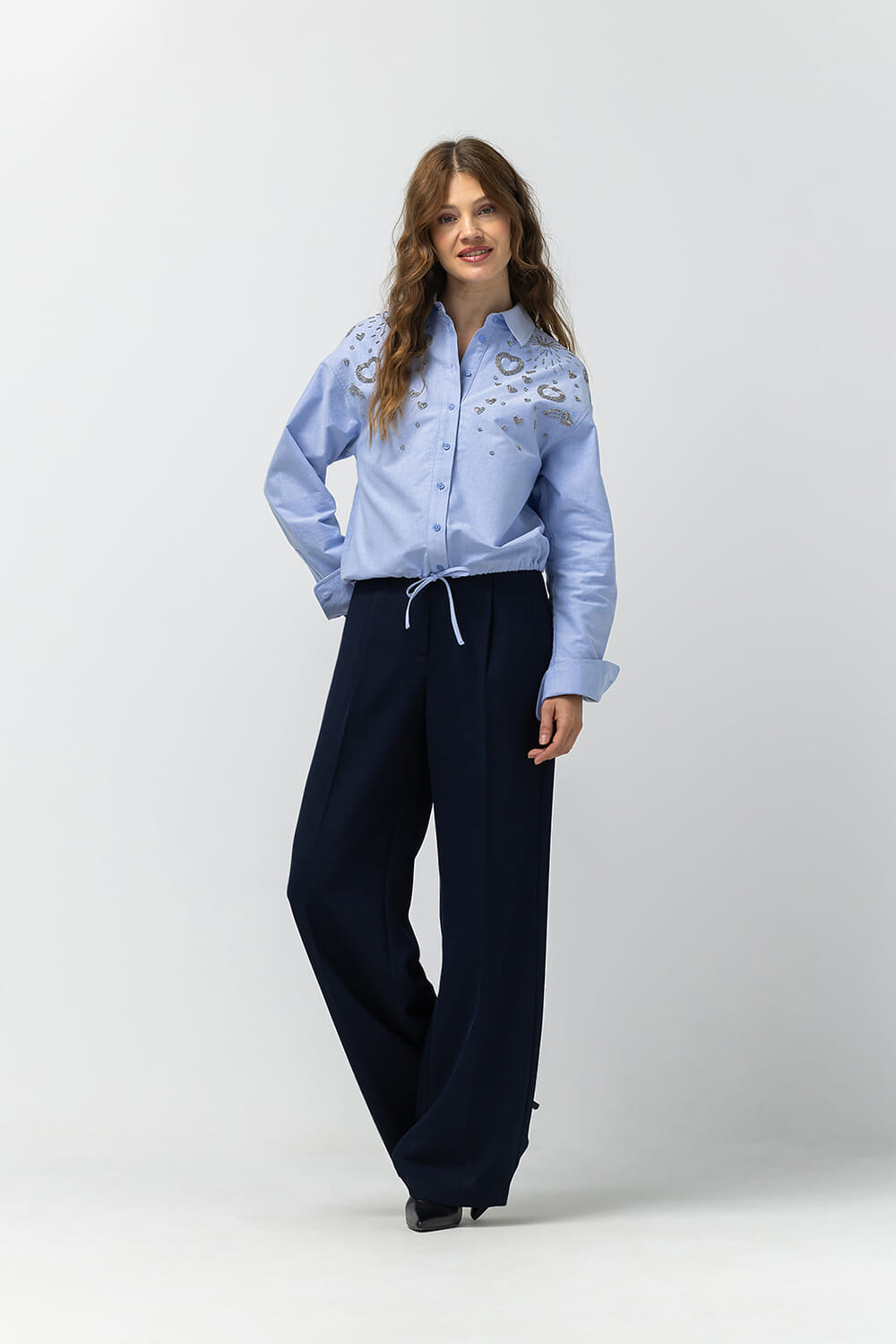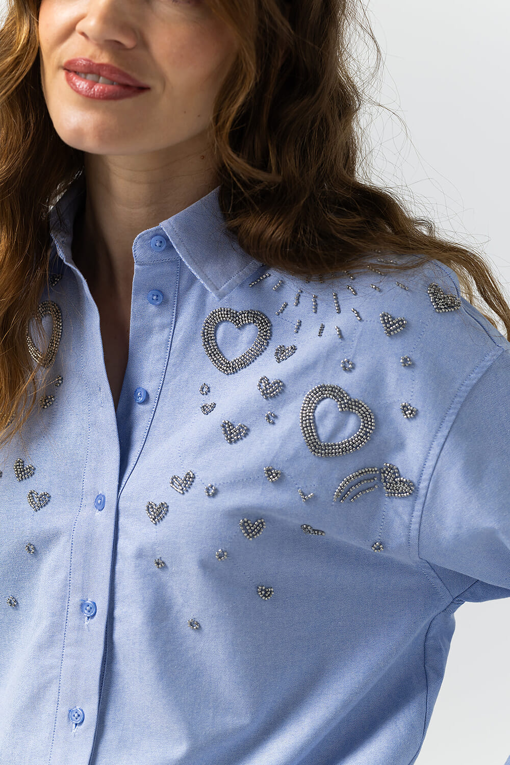 De Blouse Ayden van Label Dot is een dames blouse met een button down kraag, lange mouwen met knoopsluiting en een cropped fit. Het hartjespatroon geeft een vrouwelijke, casual uitstraling. Perfect te combineren met een vest voor een stijlvolle, toegankelijke look.
