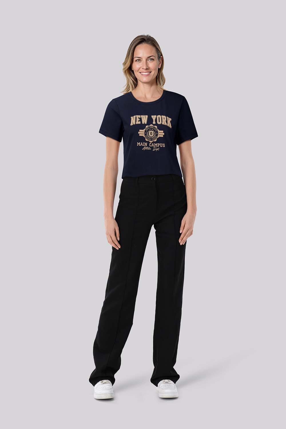 Het T-shirt Maisy van Lady Day is een casual dames t-shirt met een ronde halslijn en korte mouwen. Het heeft een effen patroon met een opvallend logo op de voorkant, ideaal voor een ontspannen dag. Perfect voor een stijlvolle, comfortabele look.