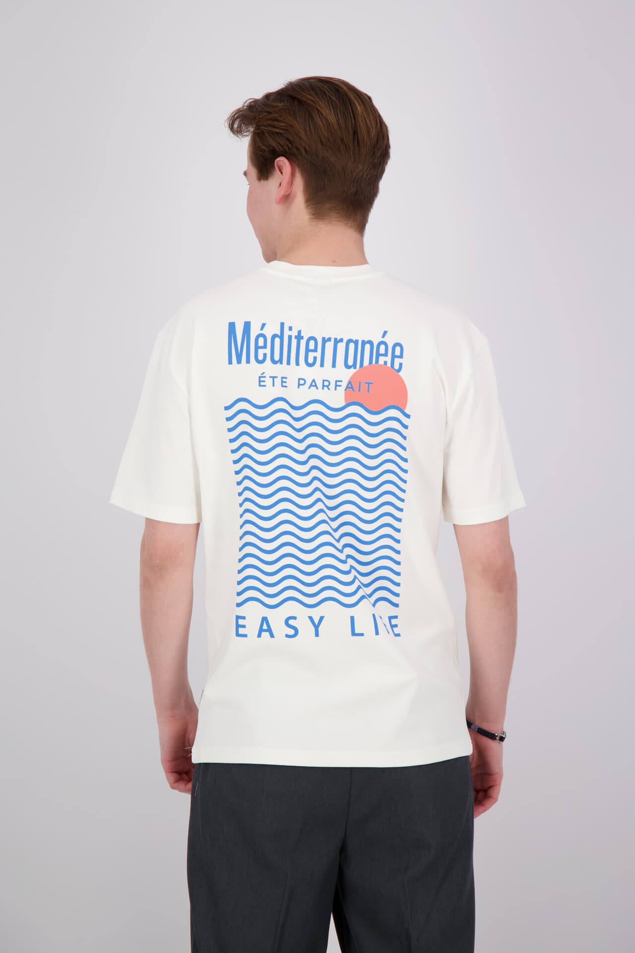 T-shirt Louis Mediteranee van Luctor is een t-shirt met ronde hals, korte mouwen en een casual pasvorm. De effen basis krijgt karakter door een klein logo op de borst en een grote grafische rugprint met golven, zon en tekst, ideaal voor ontspannen dagen.