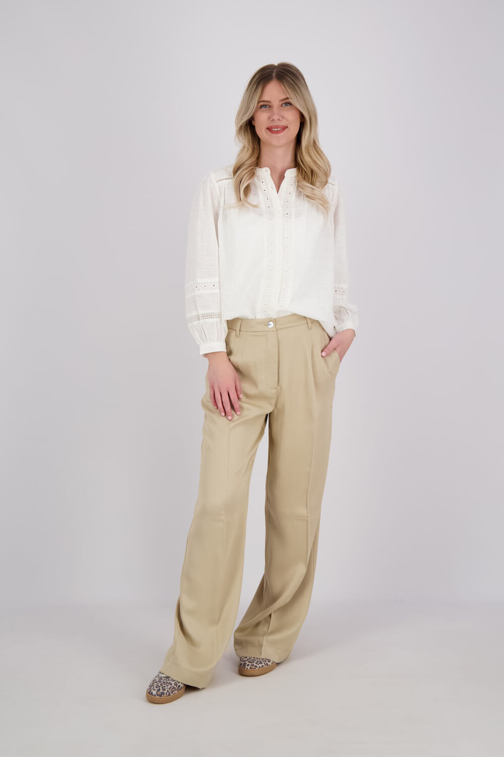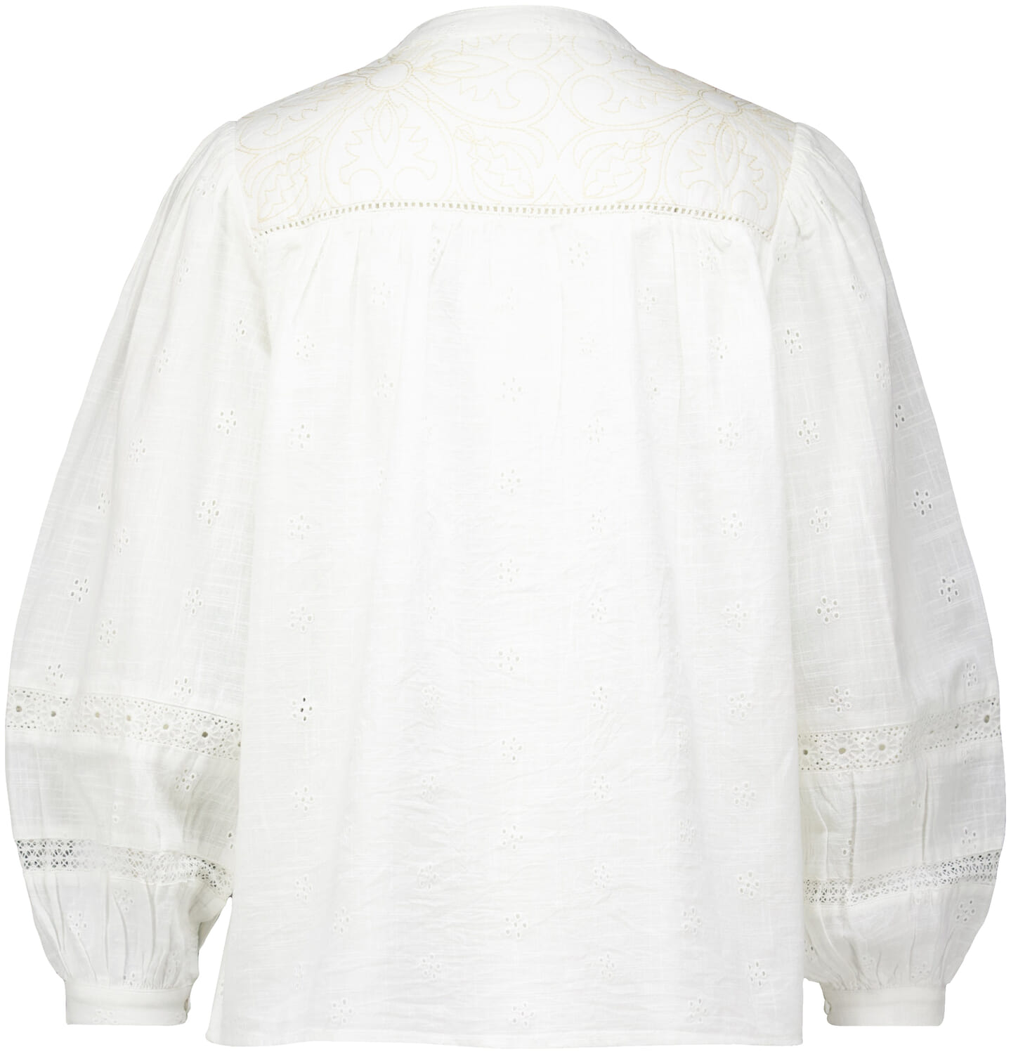 De Blouse van Maison Hotel is een casual dames blouse met een bohemian uitstraling. Het ontwerp heeft een ronde hals en een opstaande kraag, lange mouwen met knopen bij de manchetten, en een losvallende pasvorm. Het delicate gaatjespatroon zorgt voor een charmant detail.