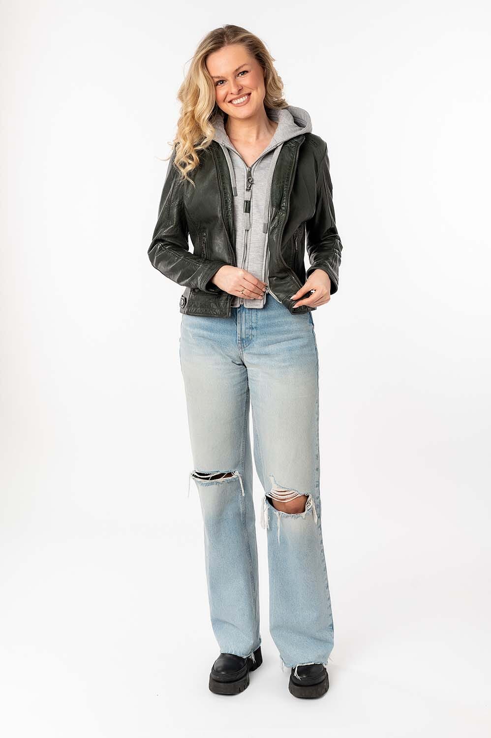 Deze leren jas Aleni van Mauritius is een casual leren tussenjas met een stijlvolle afritsbare capuchon en ritssluiting. De jas heeft een aansluitende pasvorm, ritssluiting en een ceintuurtje met knoopdetail aan de onderzijde. De binnenvoering is voorzien van een subtiele dierenprint. Knoopsluitingen op de manchetten zorgen voor een nette afwerking. Ideaal voor wie houdt van stoer & funcioneel.