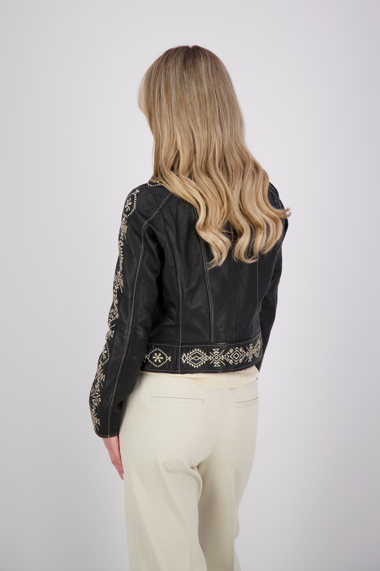 Leren jas van Mauritius met getailleerde pasvorm en blazerstijl voor een trendy, casual punk uitstraling. Voorzien van spreidkraag, reverskraag, ritssluiting en voorzakken, met grafisch patroon op mouwen en zoom, en lange mouwen met contrasterende stiksels.