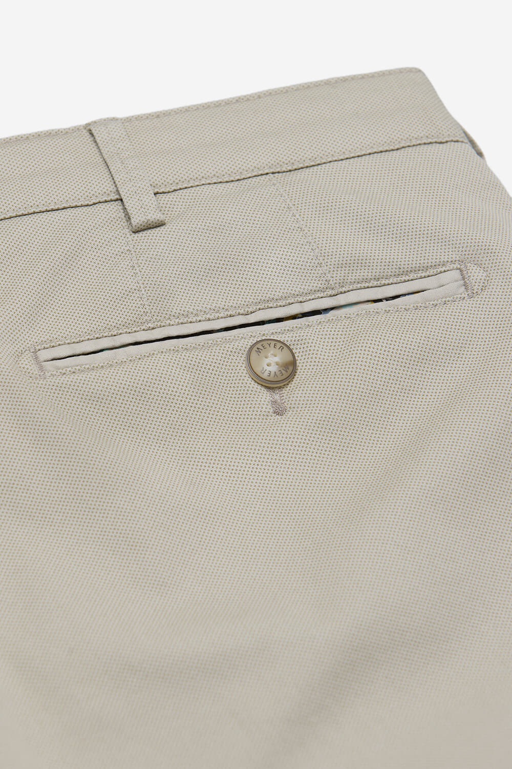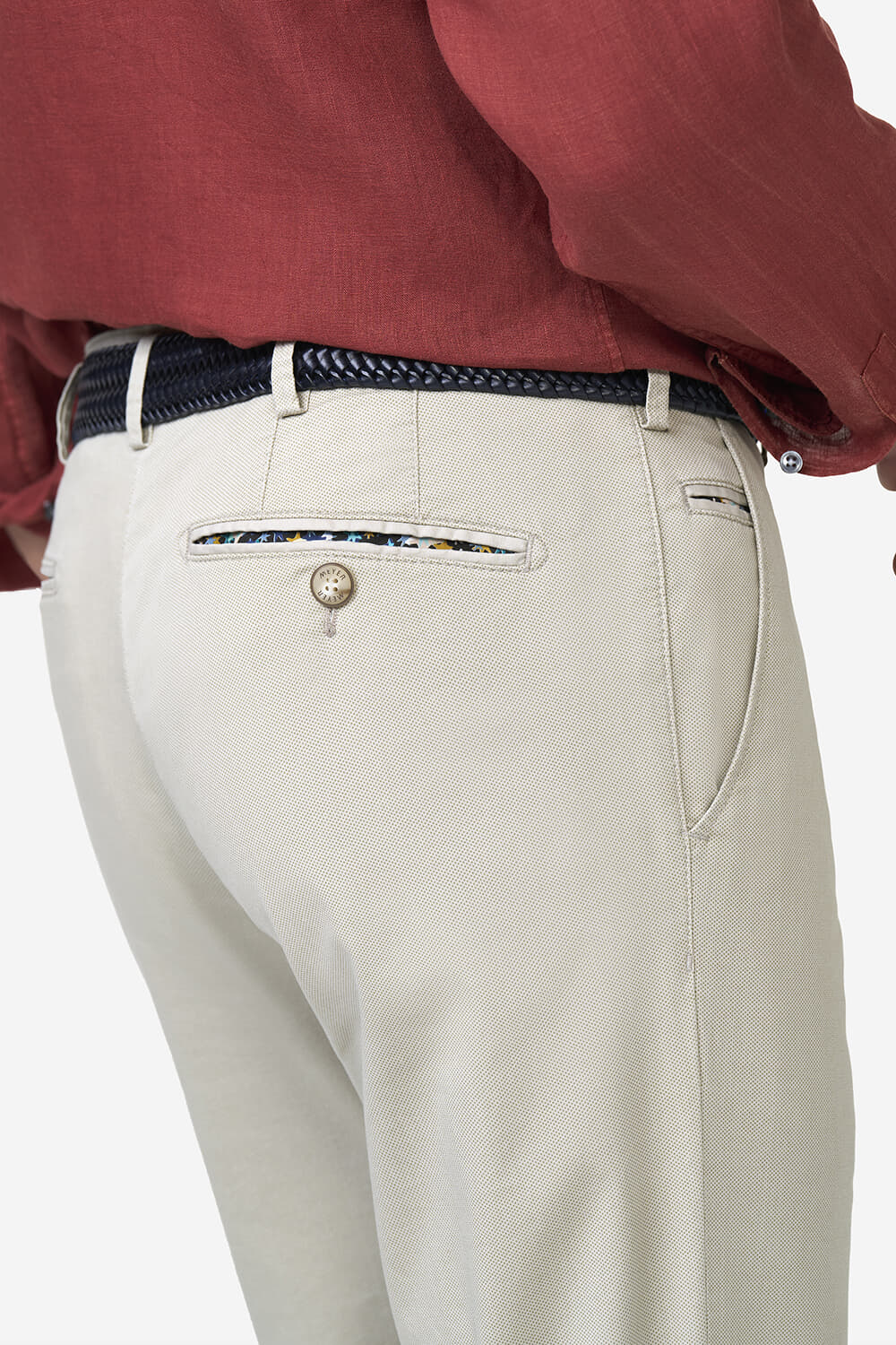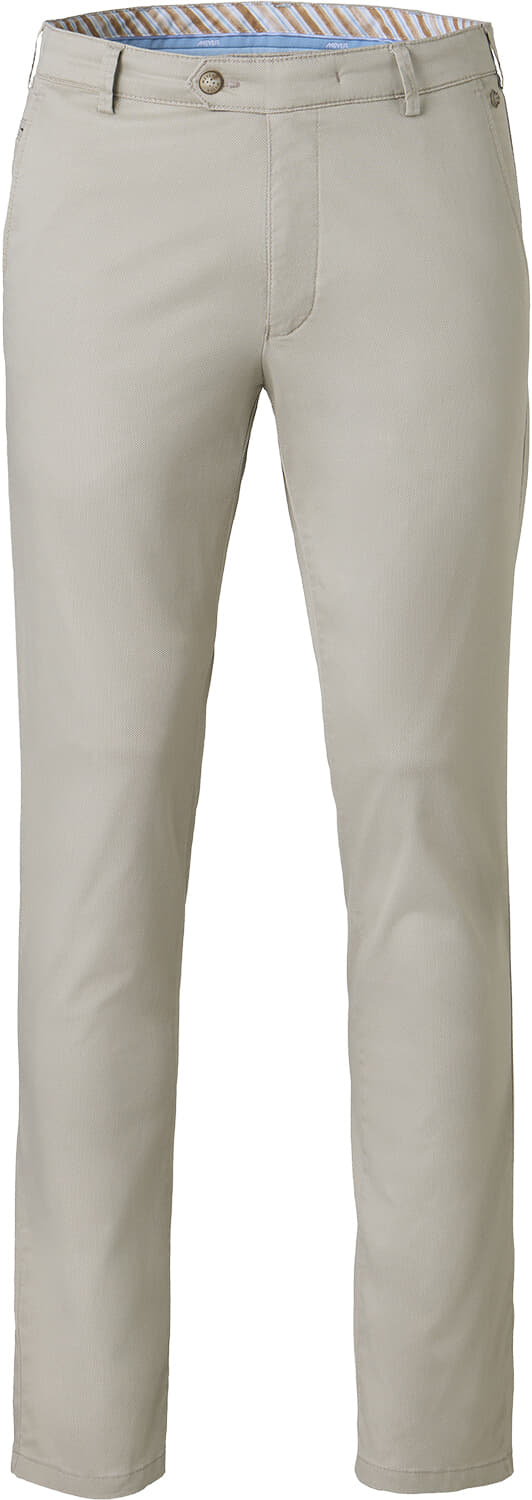 Chino Bonn is een herenpantalon van Meyer, heeft een normale taille, regular, moderne pasvorm, effen twillstructuur en een knoop- en ritssluiting. Voor- en achterzakken, achterzakken met knoop en subtiel sierbiesje. Draagt prettig casual en netjes; combineer met een overhemd of polo.