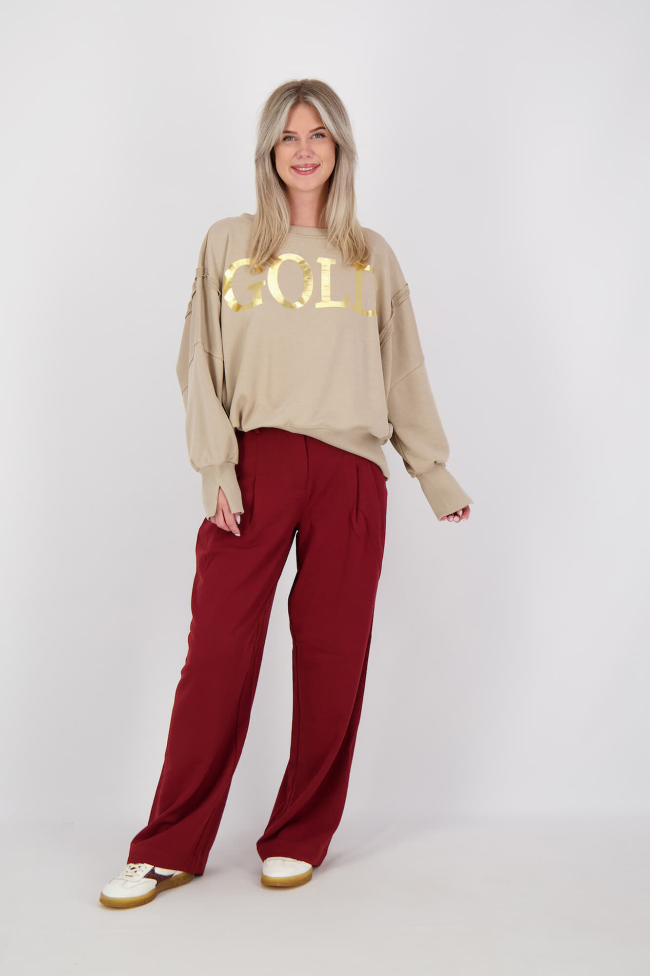 De Sweater Gold van Miss Goodlife biedt een comfortabele oversized pasvorm, ideaal voor casual gelegenheden. Deze effen dames sweater heeft een ronde halslijn en lange mouwen met ribgebreide mouwboorden. Het stijlvolle gouden opdruk maakt het een modieuze keuze voor elke garderobe.