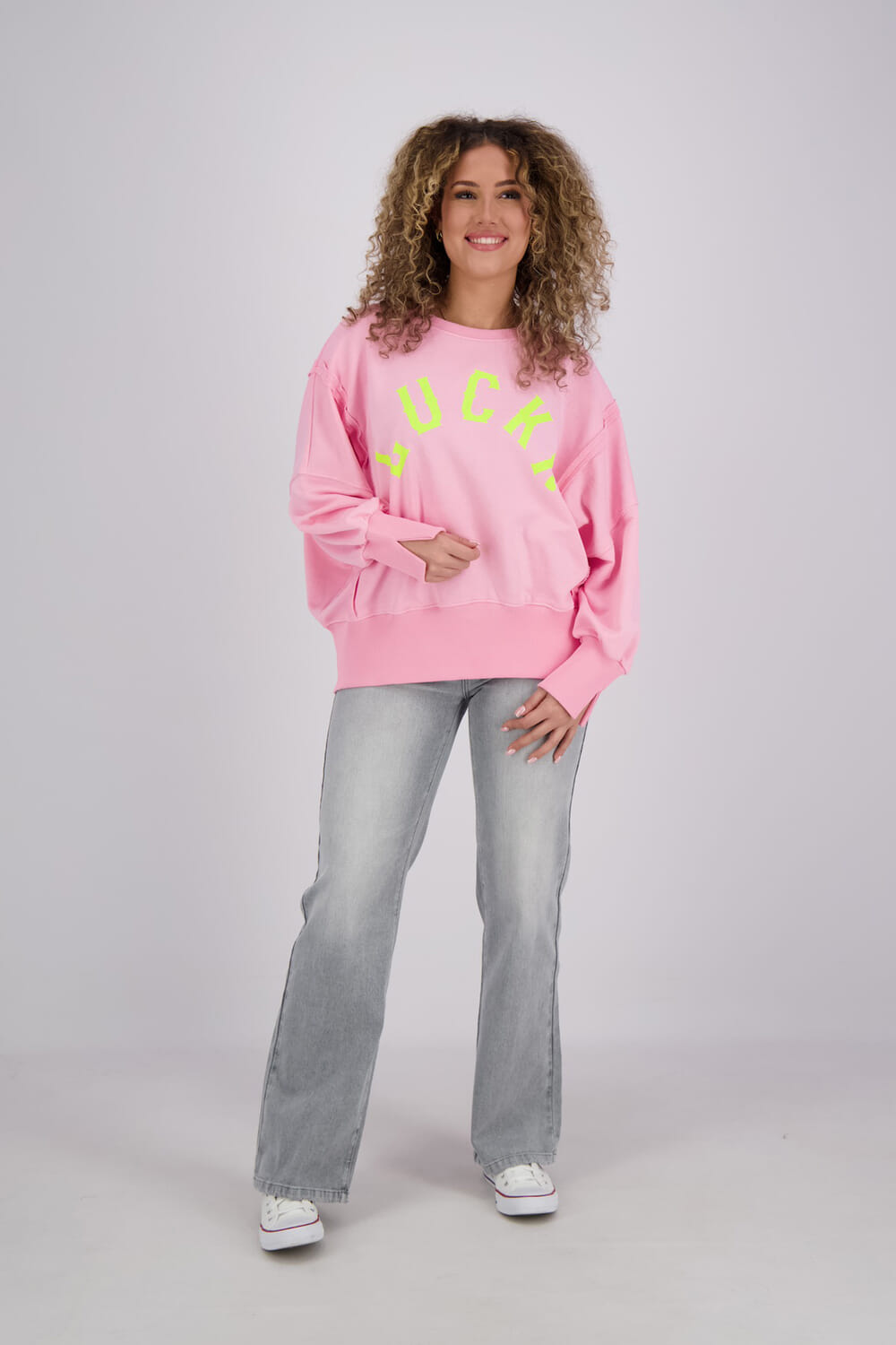 De Sweater Lucky Wide van Miss Goodlife combineert comfort met stijl. Deze casual sweater heeft een oversized pasvorm, een ronde halslijn en lange mouwen met ribgebreide boorden. Het opvallende logo-patroon voegt een speels accent toe, perfect voor een ontspannen, modieuze uitstraling.