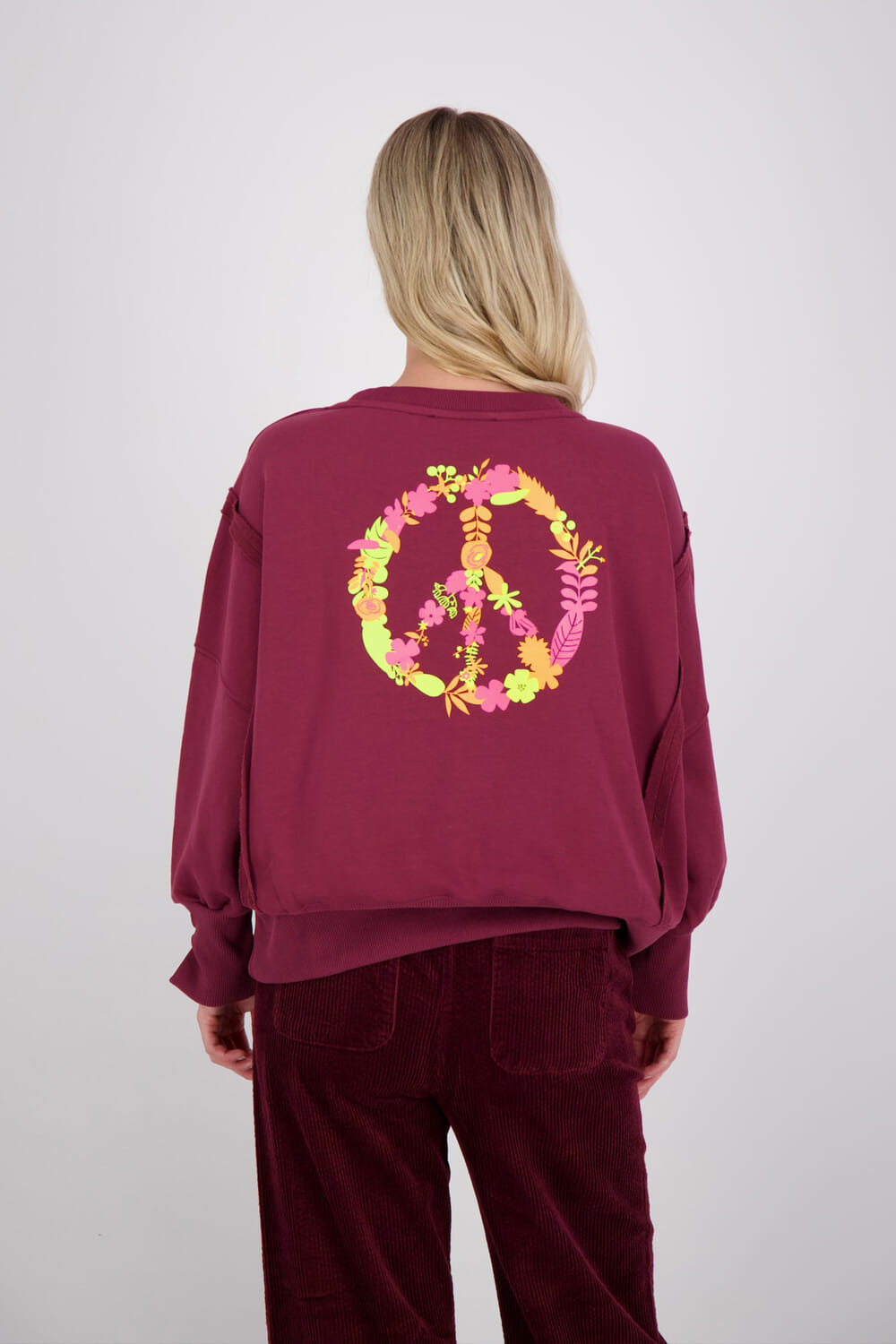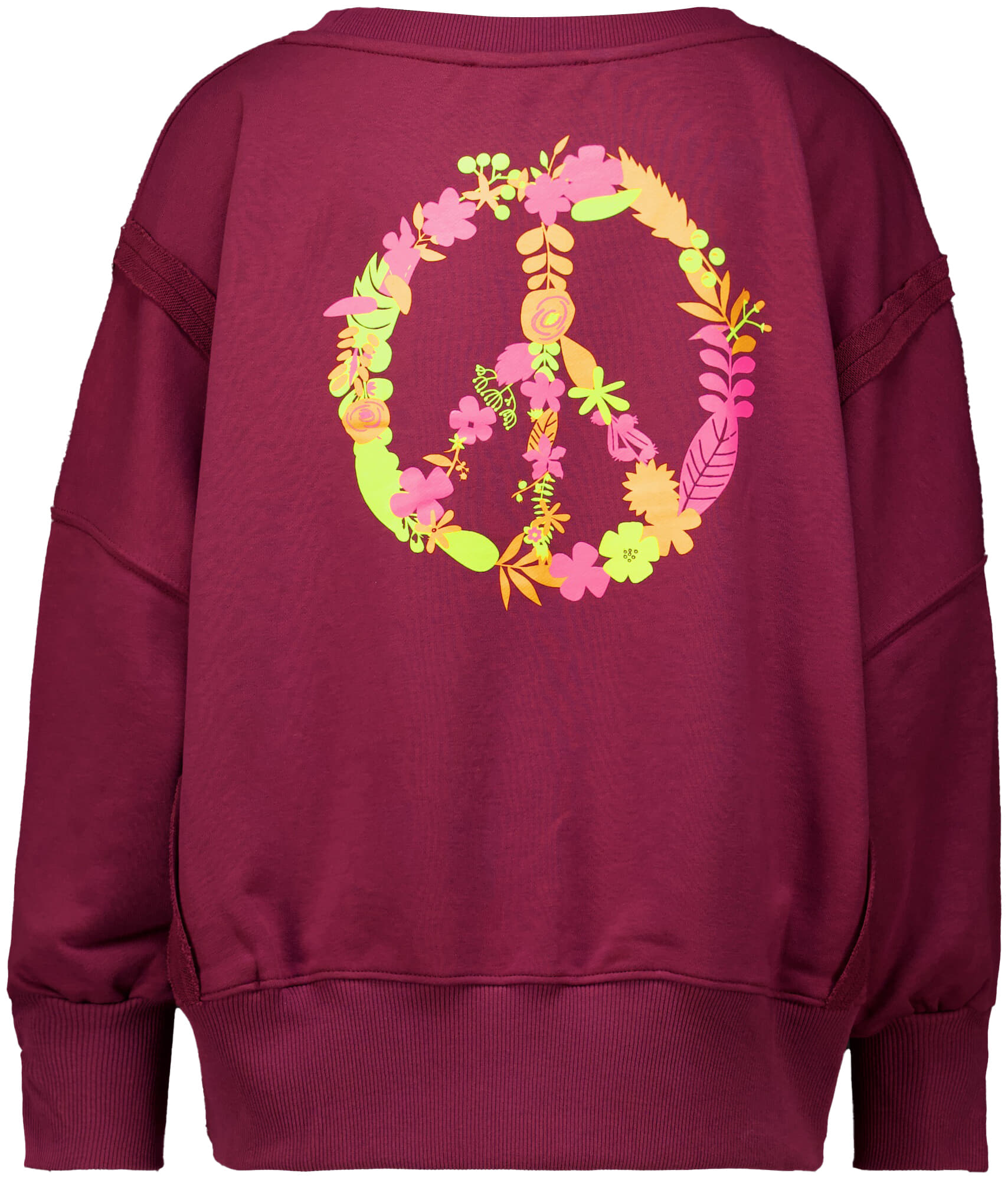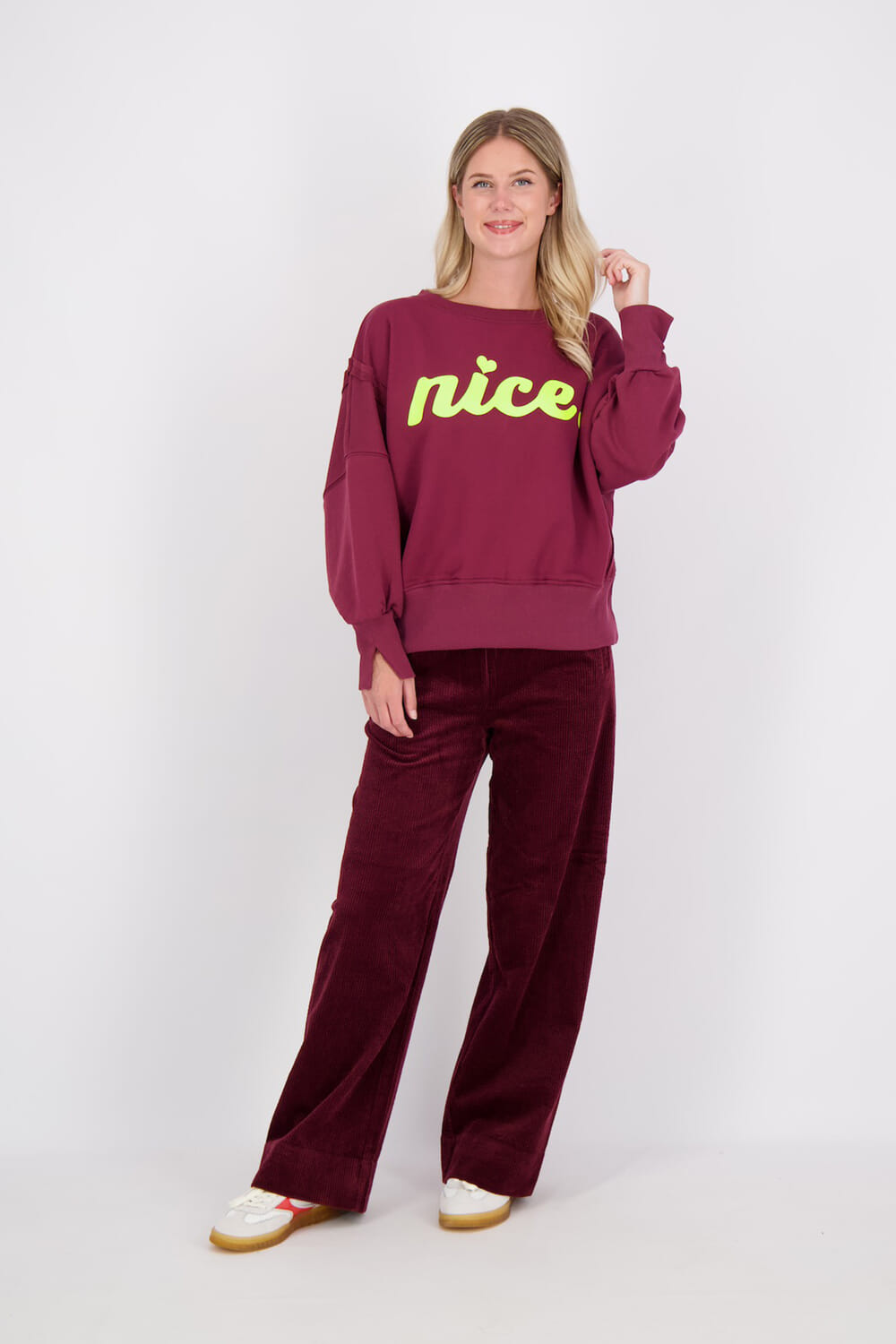 De sweater Nice van Miss Goodlife, een casual sweater, biedt een brede pasvorm met een ronde hals en lange mouwen. Met een vrolijk grafisch bloemenpatroon en een opvallende tekst aan de voorkant, is deze sweater perfect voor een ontspannen en stijlvolle look.