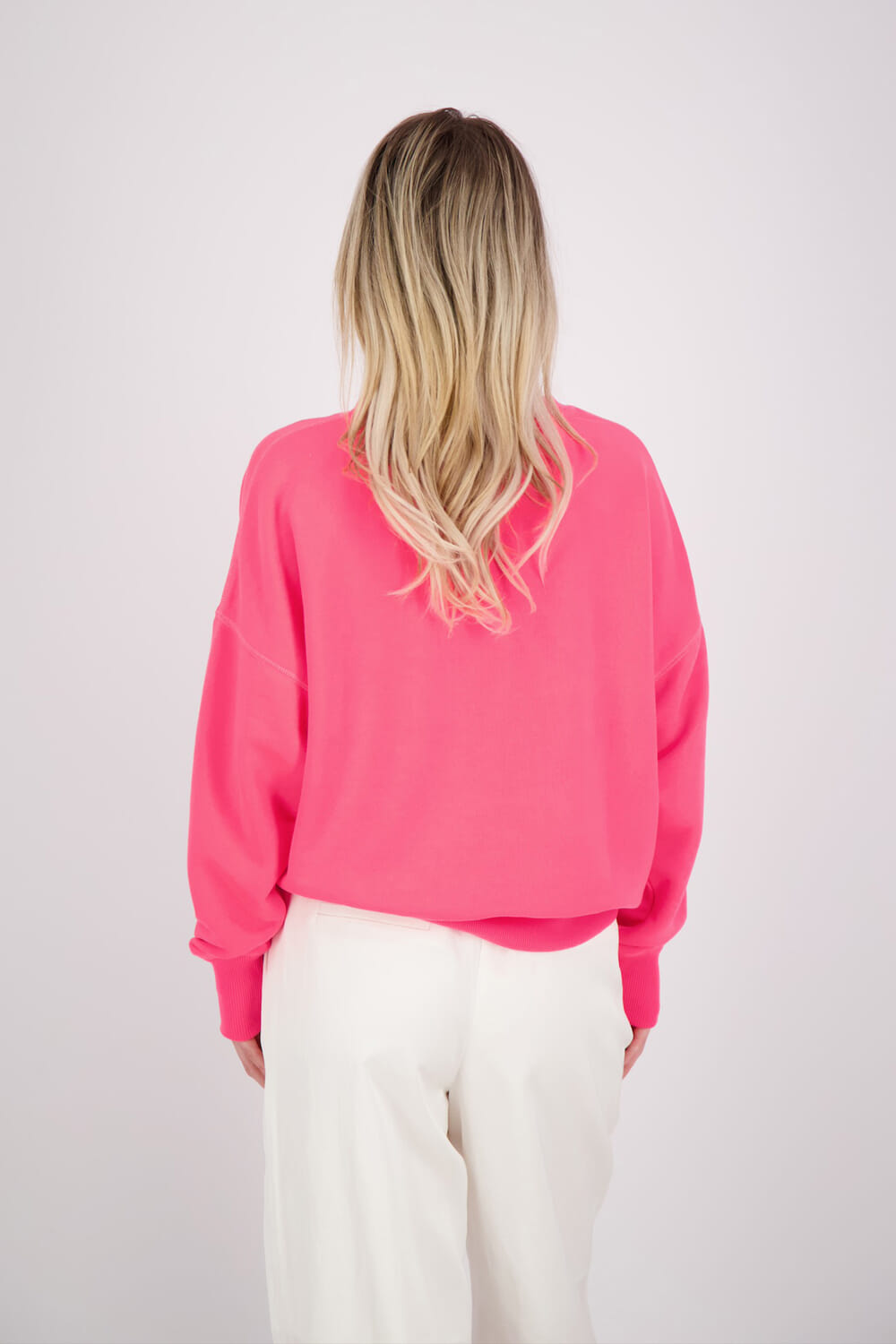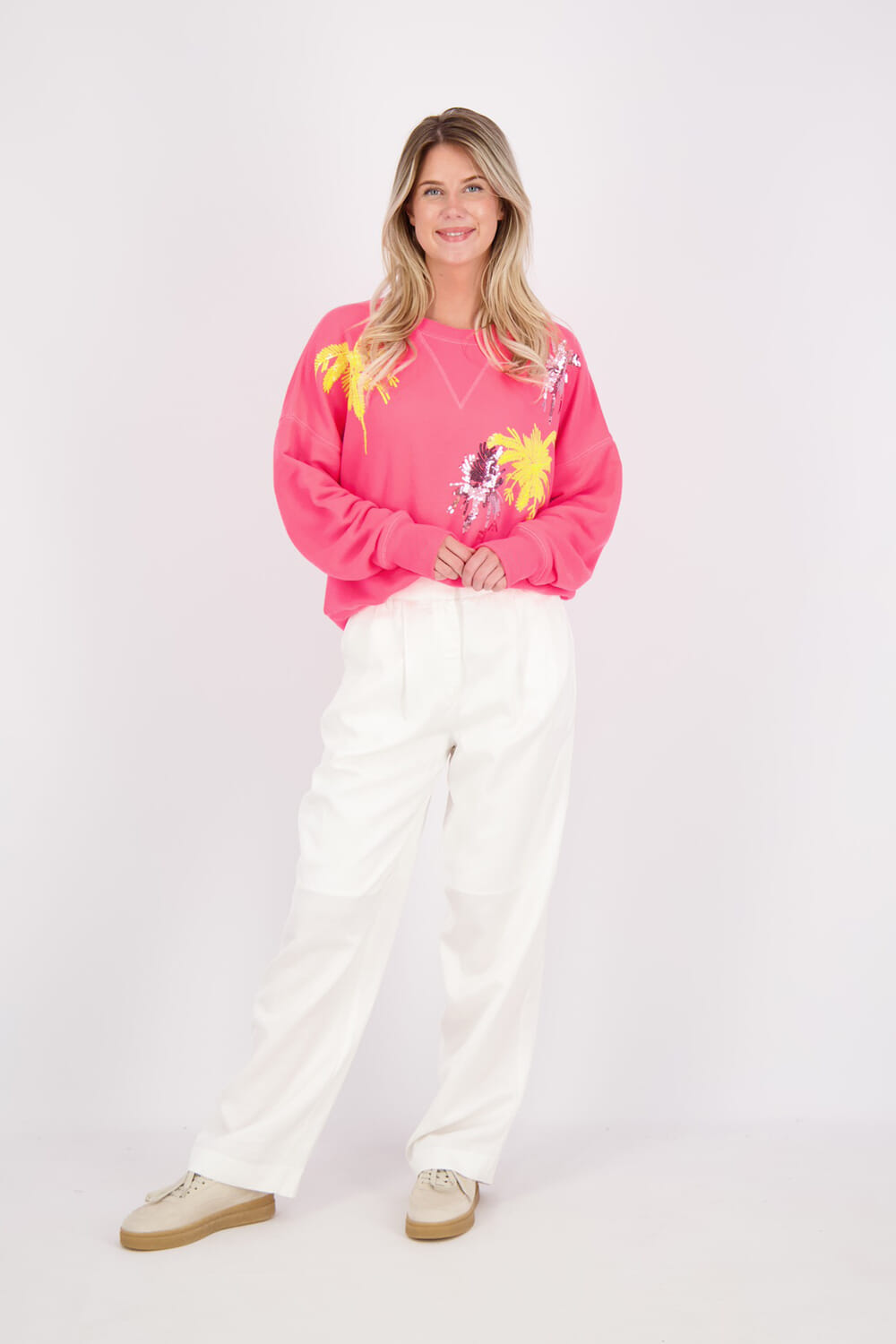 De Sweater Palmtree van Miss Goodlife is een stijlvolle dames sweater met een ronde hals en ribgebreide mouwboorden. Deze casual sweater heeft een oversized pasvorm en lange mouwen. Het grafische patroon van palmbomen voegt een speels element toe aan dit unieke kledingstuk.