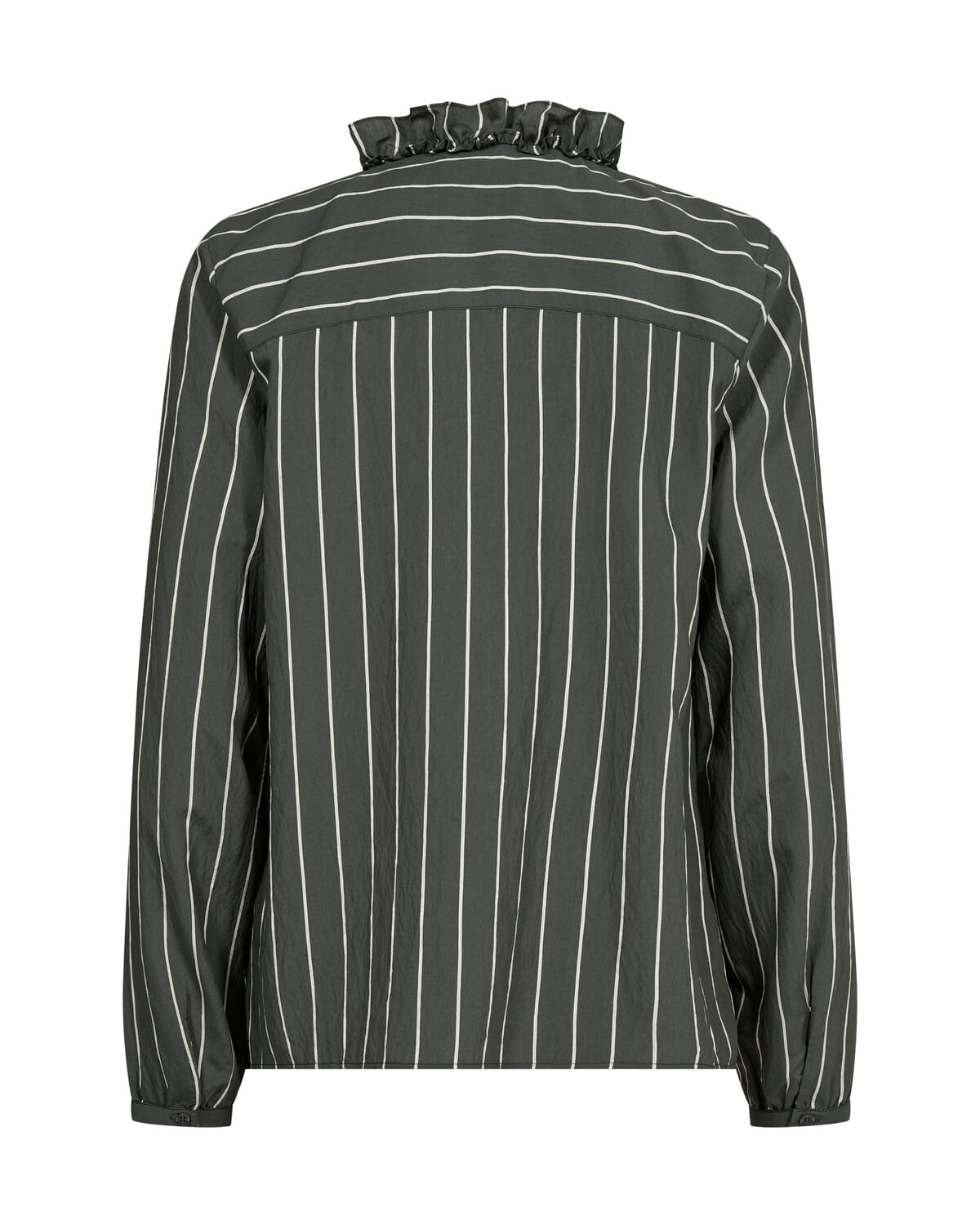 De blouse billie stripe van Mos Mosh is een stijlvolle dames blouse met lange mouwen en een elegante streepprint. De regular pasvorm en vrouwelijke stijl worden versterkt door de speelse ruches langs de kraag en knopenlijst, waardoor dit kledingstuk zowel chic als veelzijdig is.