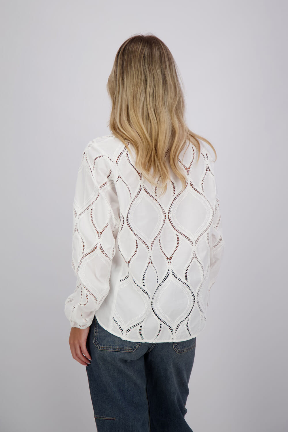 Blouse Nolin Caminno van Mos Mosh is een stijlvolle dames blouse met een regular fit en lange mouwen. Het unieke gaatjespatroon en de button down kraag geven het een casual uitstraling. Ideaal voor elke gelegenheid, deze blouse combineert moeiteloos comfort en stijl.