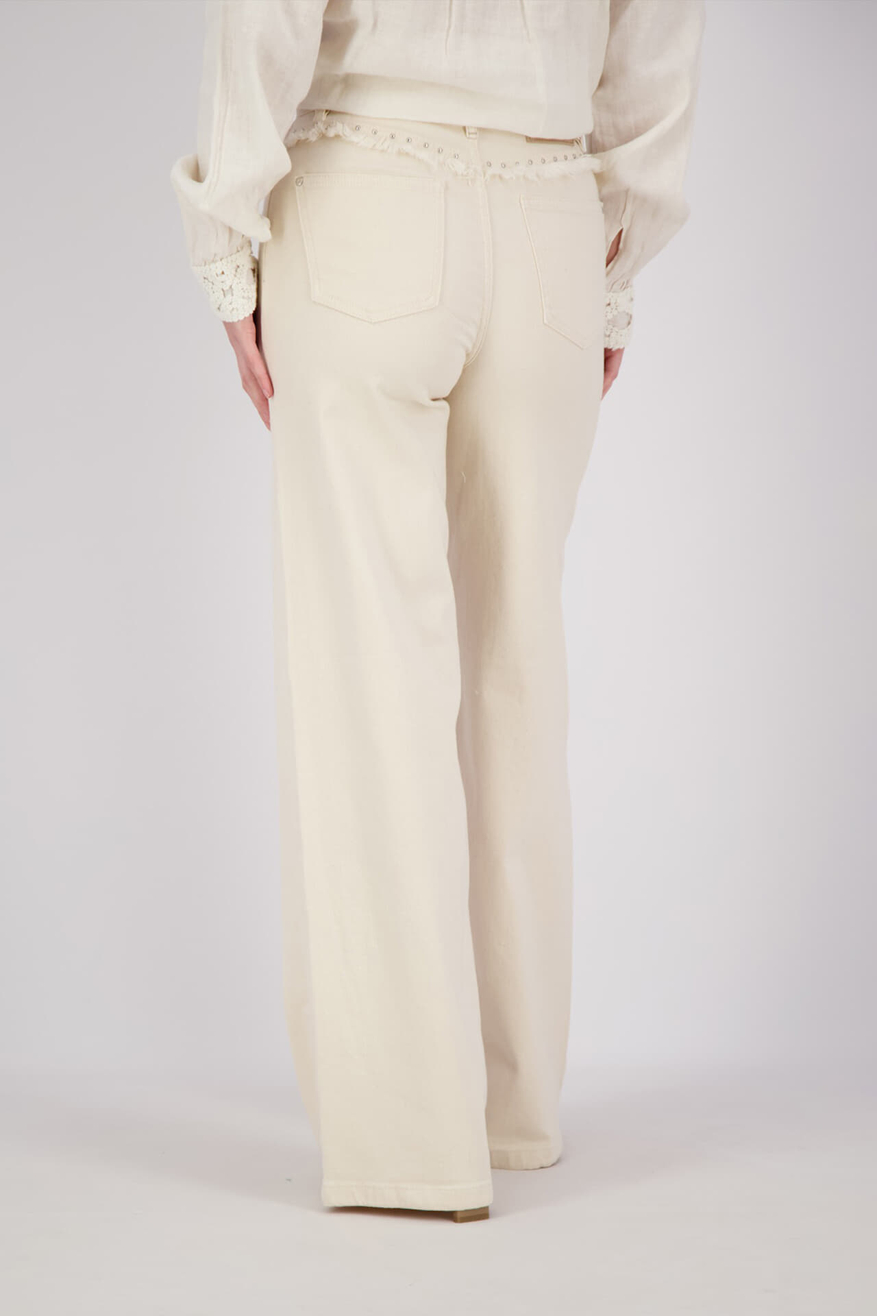 Broek Colette van Mos Mosh is een lange broek met normale taille, wijde pijpen en een effen, beige tint. De knoop- en ritssluiting en 5 zakken zorgen voor gemak, met subtiele studs bij de zakken. Combineer met een simpele top en sneakers of loafers.