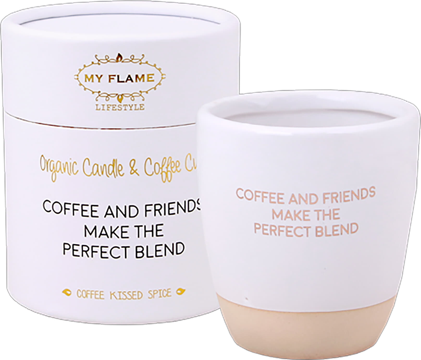 Breng warmte in je dag met deze minimalistische geurkaars in een stijlvolle keramieken pot. De quote Coffee and friends make the perfect blend geeft een casual, moderne touch aan je interieur. Geniet van een zachte, kruidige koffiegeur die uitnodigt tot ontspannen momenten thuis. Mooi op tafel, op je bureau of in de badkamer, en ook een verfijnd cadeau-idee voor iemand die je graag ziet.