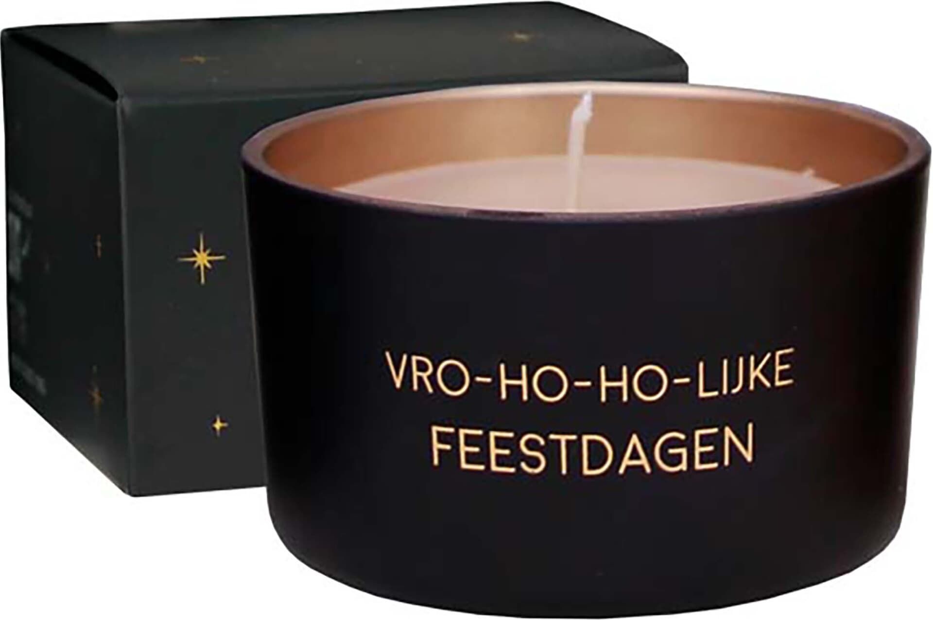Te leuke geurkaars. De kaars is gemaakt van biologische sojawas en heeft de geur Winter Wood. Op het glas staat de tekst; Vro-ho-ho-lijke feestdagen. Een super leuk cadeau voor de kerst. De kaars brandt ca. 30 uur.