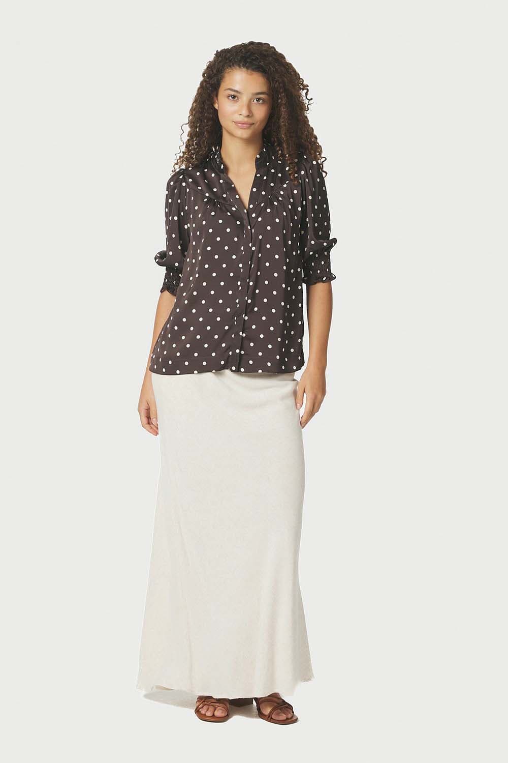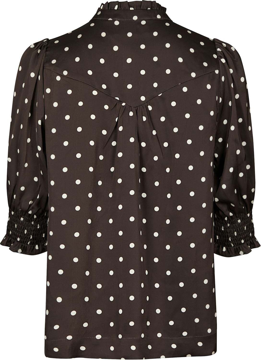 De Blouse Diana van Neo Noir is een stijlvolle blouse met een vrouwelijke uitstraling. Het heeft een opstaande kraag, 3 kwart mouwen met elastische manchetten en een knoopsluiting. Het stippenpatroon geeft het een speelse touch, perfect voor elke casual gelegenheid.