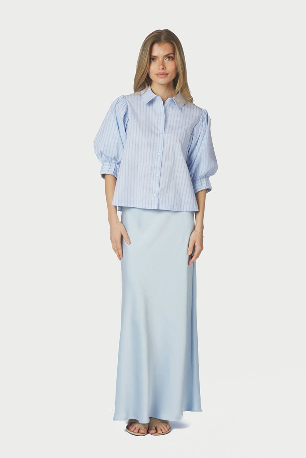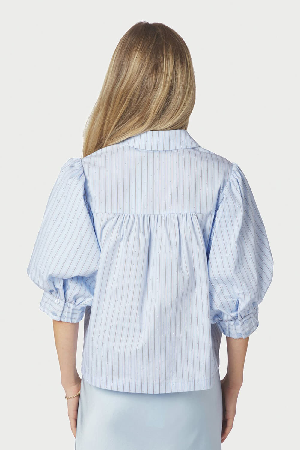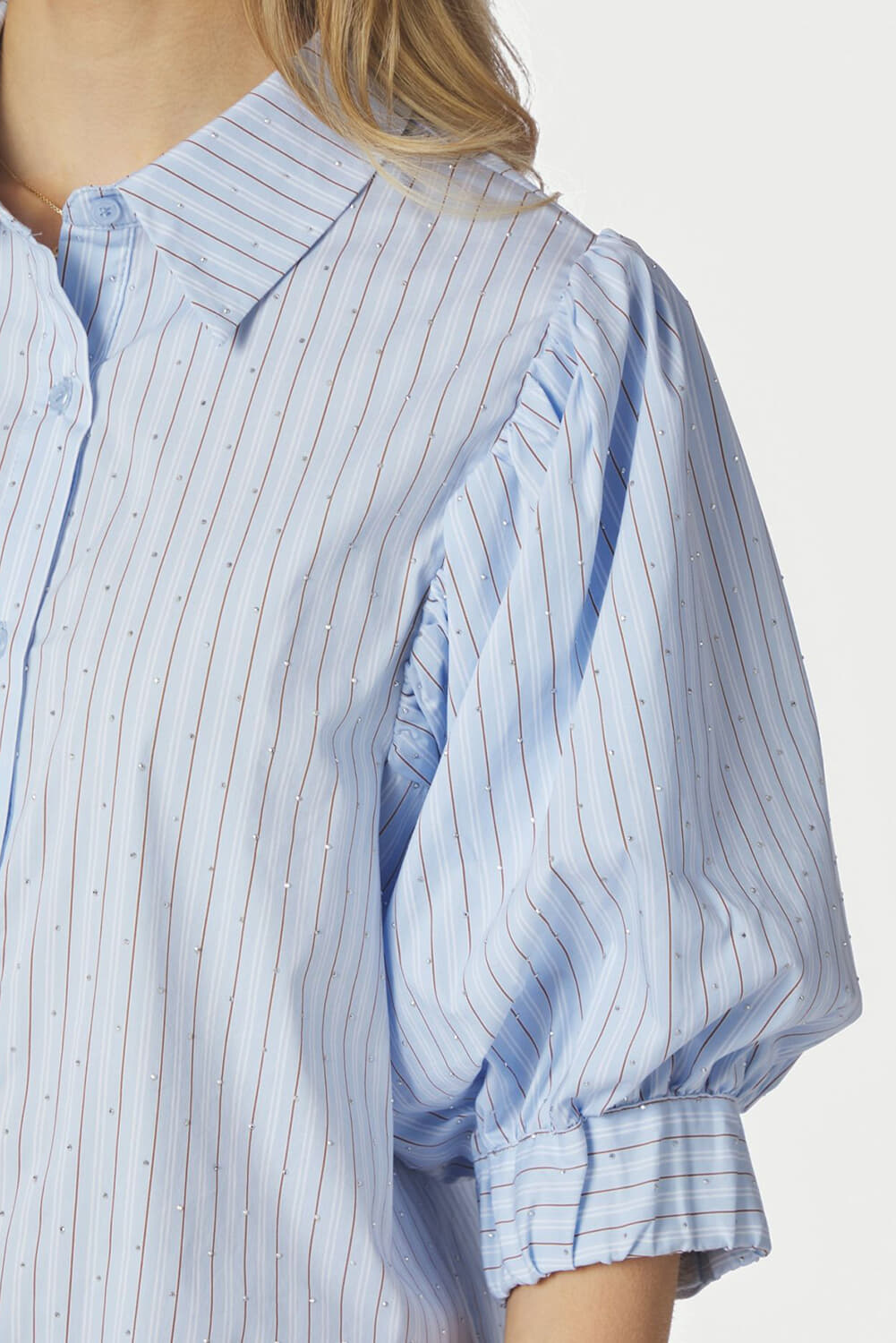 Blouse Etta Stripe van Neo Noir biedt een stijlvolle casual look. Deze dames blouse heeft een button-down kraag en een overhemdband met een uniek streeppatroon. De 3/4 mouwen geven een speelse touch, ideaal voor elke gelegenheid. Voeg dit veelzijdige kledingstuk toe aan je collectie.