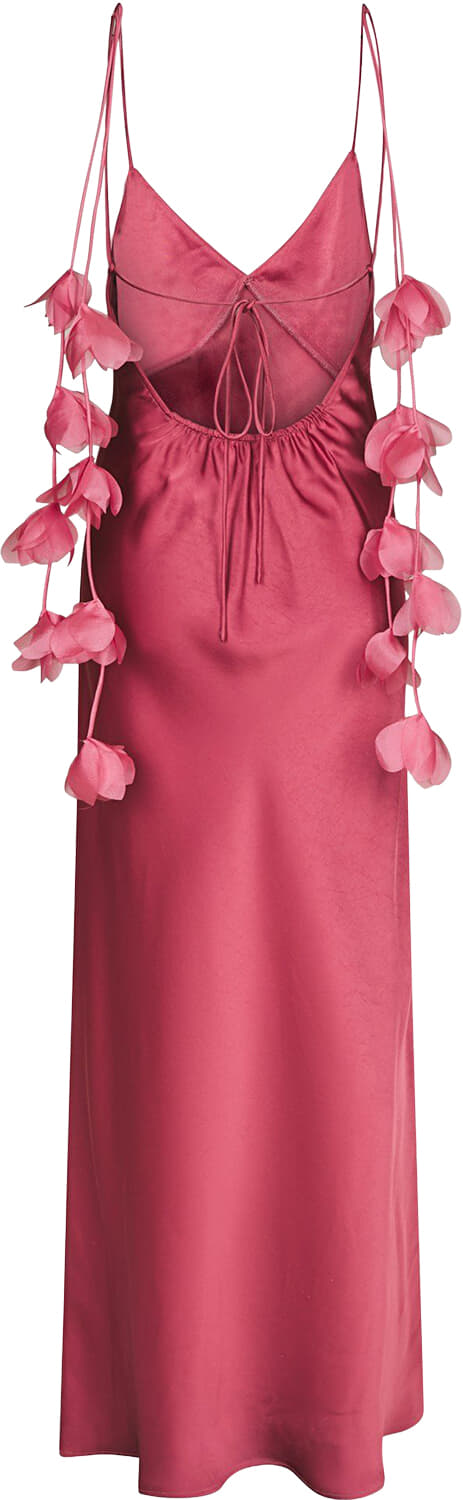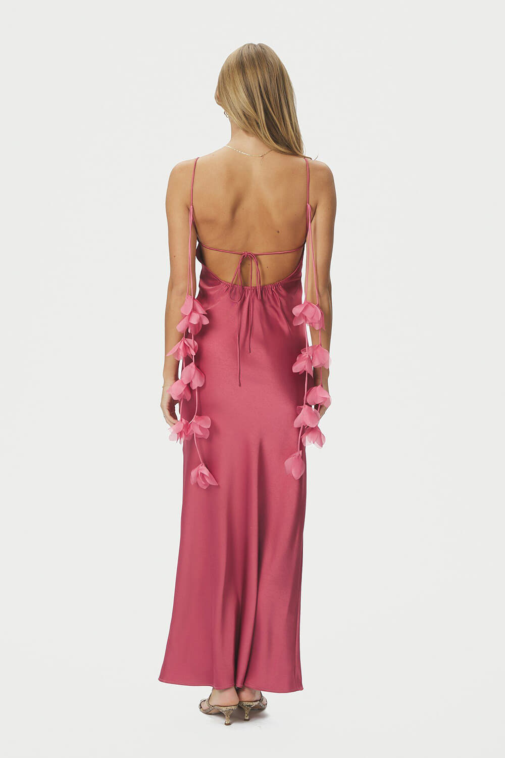 Deze elegante maxi jurk heeft een vrouwelijke V-hals en is mouwloos uitgevoerd in een effen kleur. De gladde, soepelvallende stof volgt het lichaam op een slanke manier en zorgt voor een flatterend silhouet. De lage rug met striksluiting geeft de jurk een speelse en verfijnde uitstraling, terwijl de fijne bandjes met subtiele bloemdetails een romantisch accent toevoegen. Perfect te combineren met sandalen en een clutch voor een zomerse, stijlvolle look.