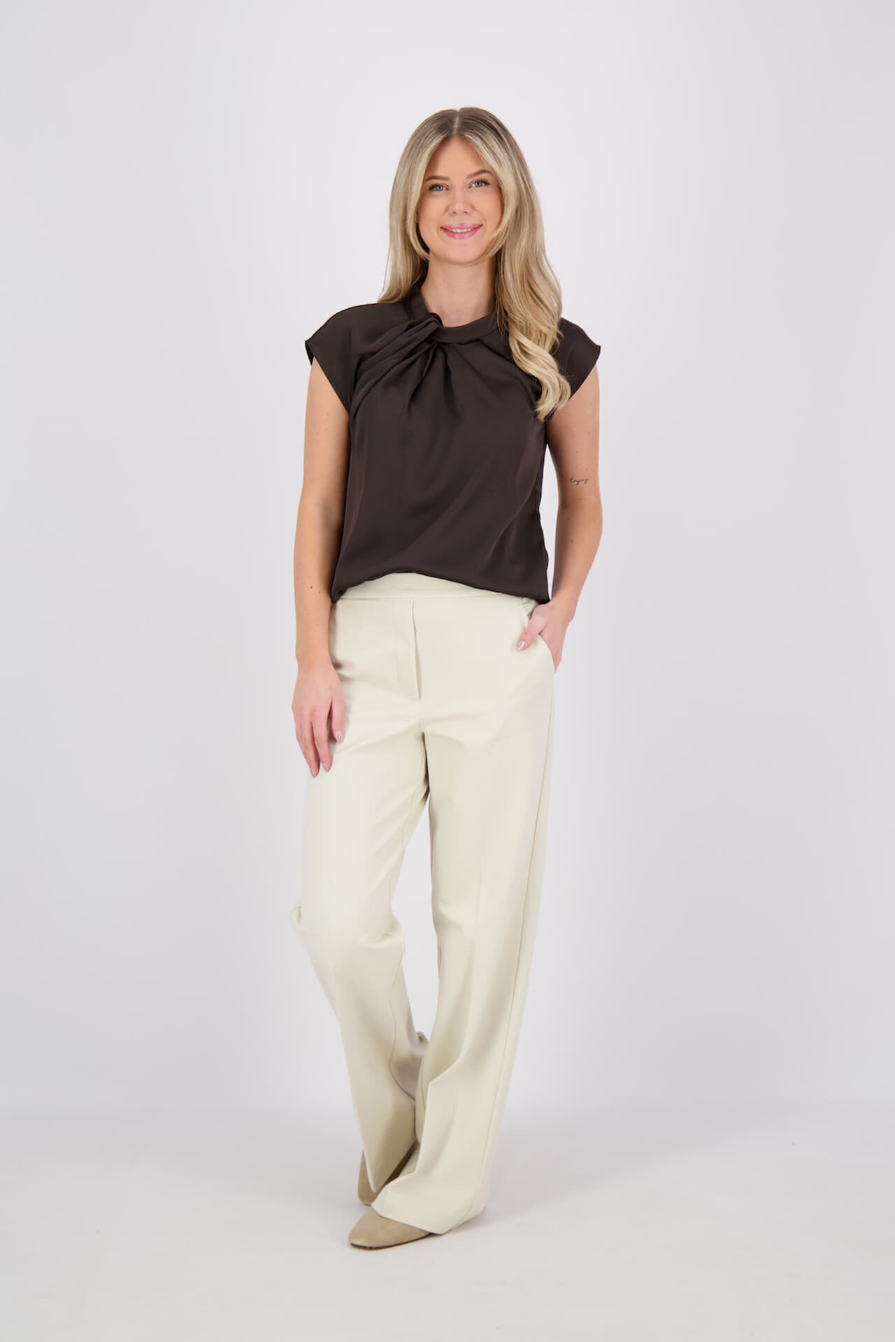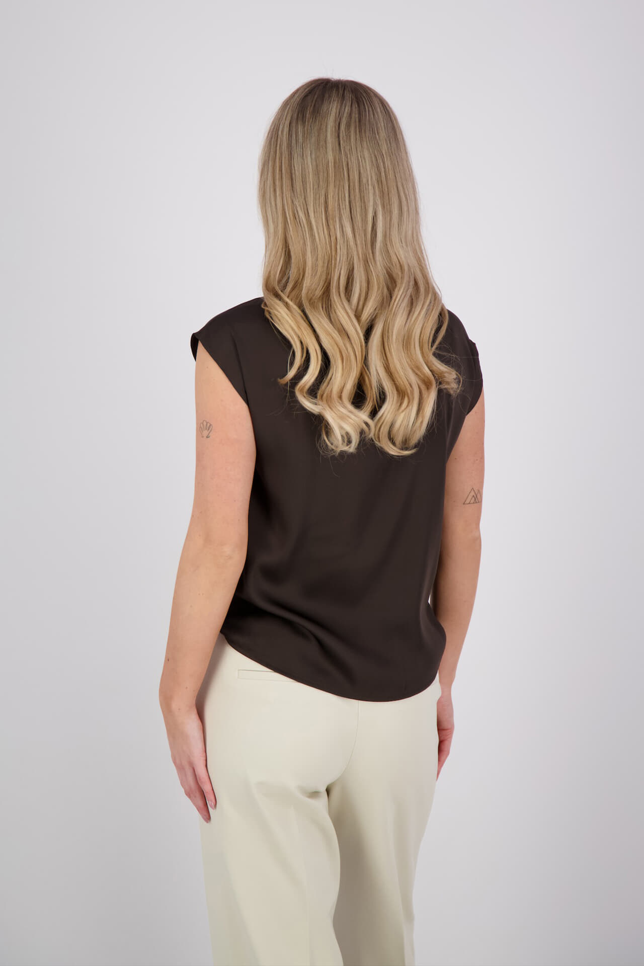 De Top Fleur van Neo Noir is een mouwloze top met een opstaande kraag en knoopsluiting. De losse pasvorm en effen patroon maken het een stijlvolle keuze voor nette gelegenheden. Perfect voor een elegante uitstraling zonder mouwen.