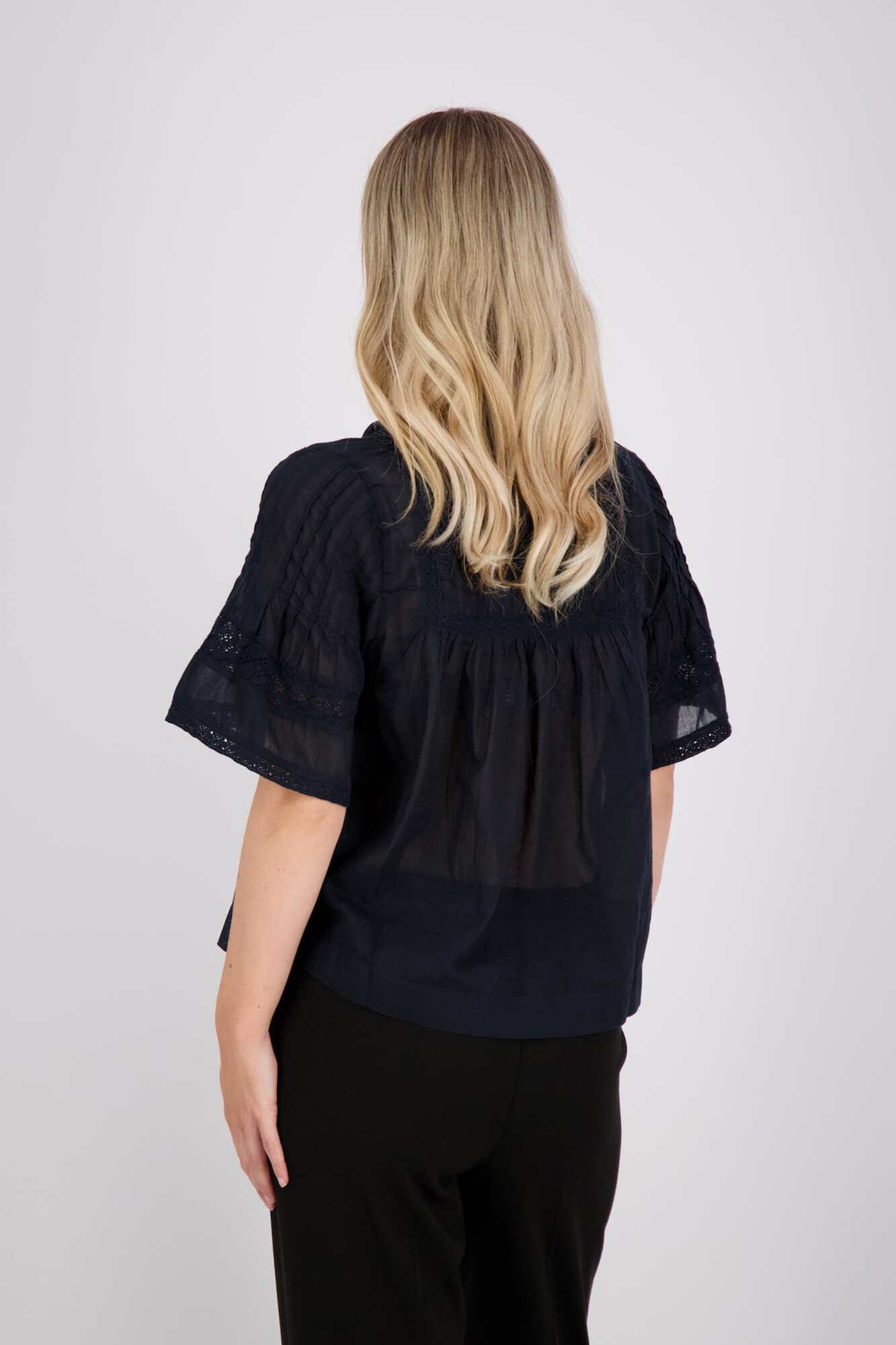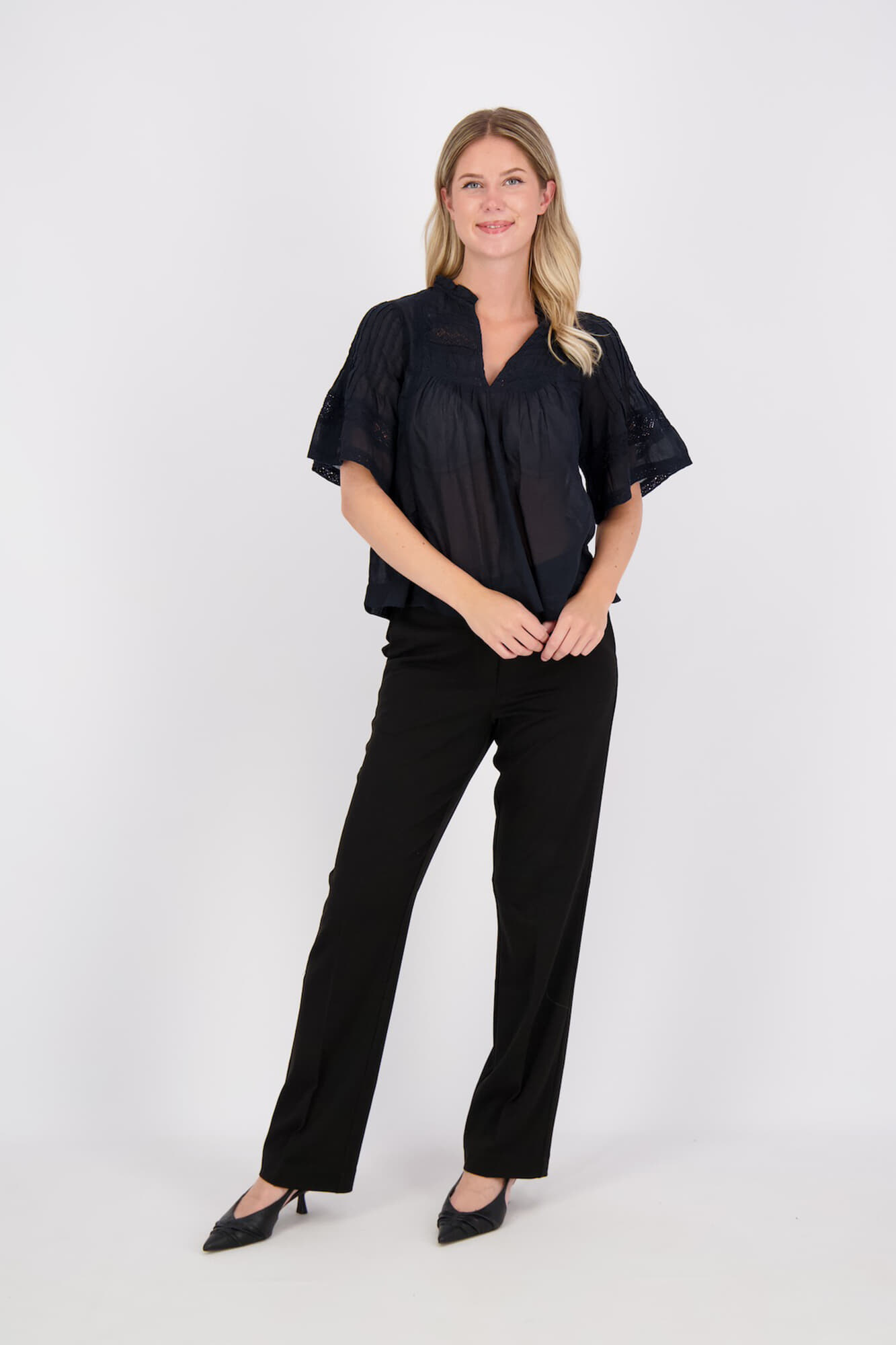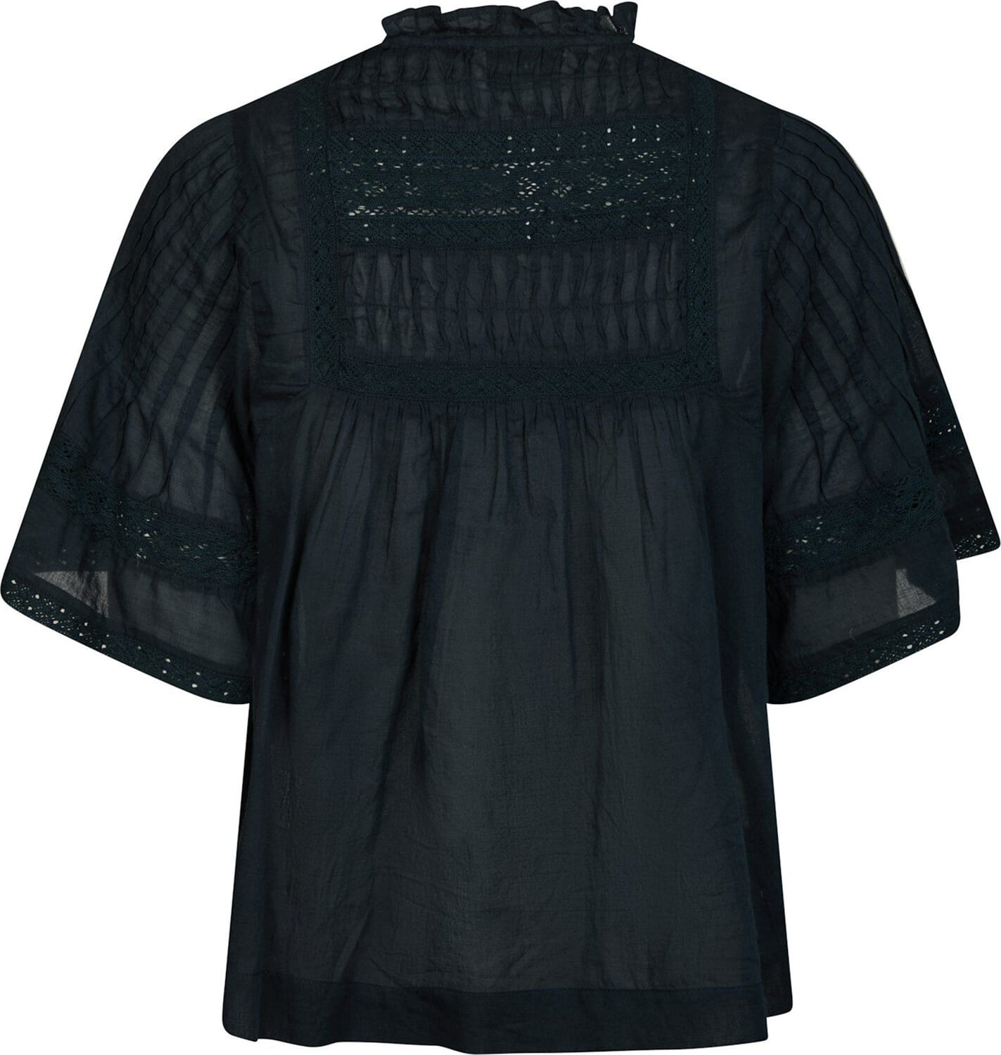 De Siama's voile top van Neo Noir is een elegante dames top met korte mouwen. De top heeft een vrouwelijke V-halslijn en losse pasvorm, afgewerkt met prachtige gaatjespatronen. De driekwart mouwen bieden een stijlvolle en luchtige look voor elke gelegenheid.