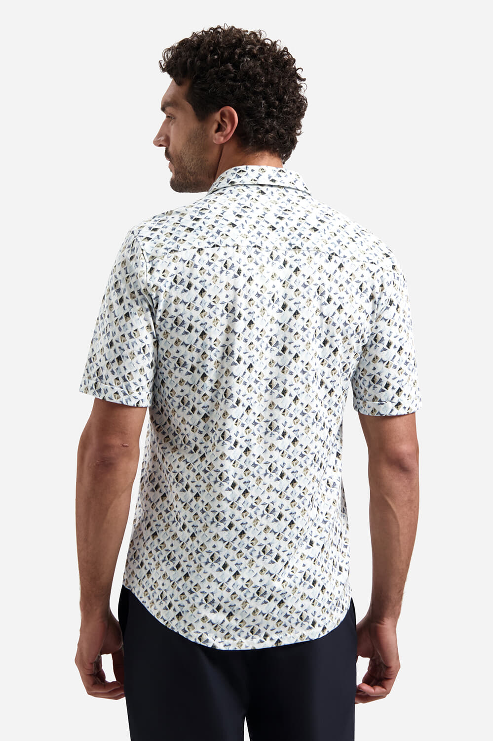 Overhemd Jersey Allover Print van No Excess is een casual overhemd met grafische print, spreidkraag en knoopsluiting. De regular pasvorm en korte mouwen dragen comfortabel en vallen netjes. De lichte basis met blauw, zand en grijs combineert makkelijk met een chino of short.