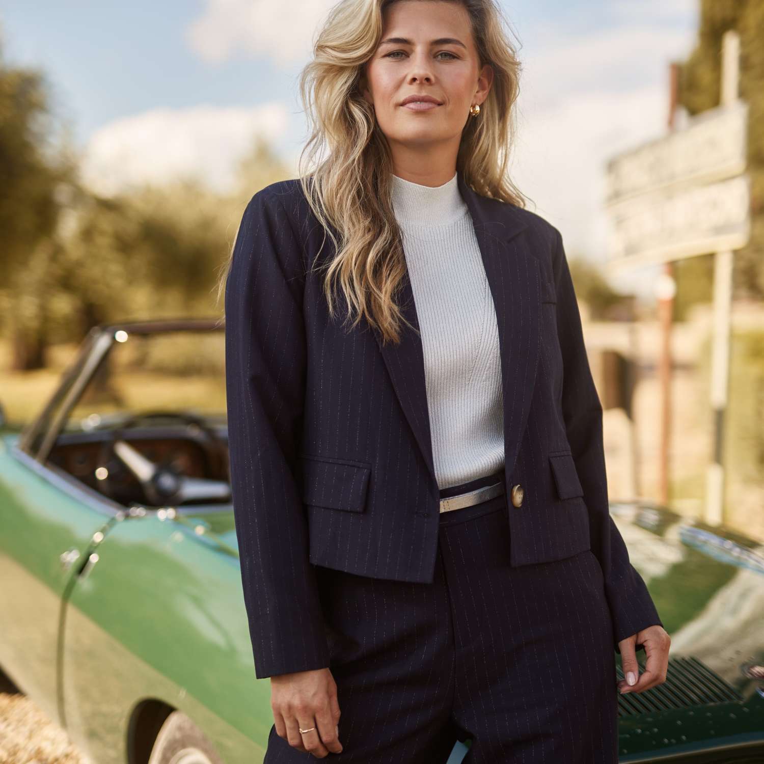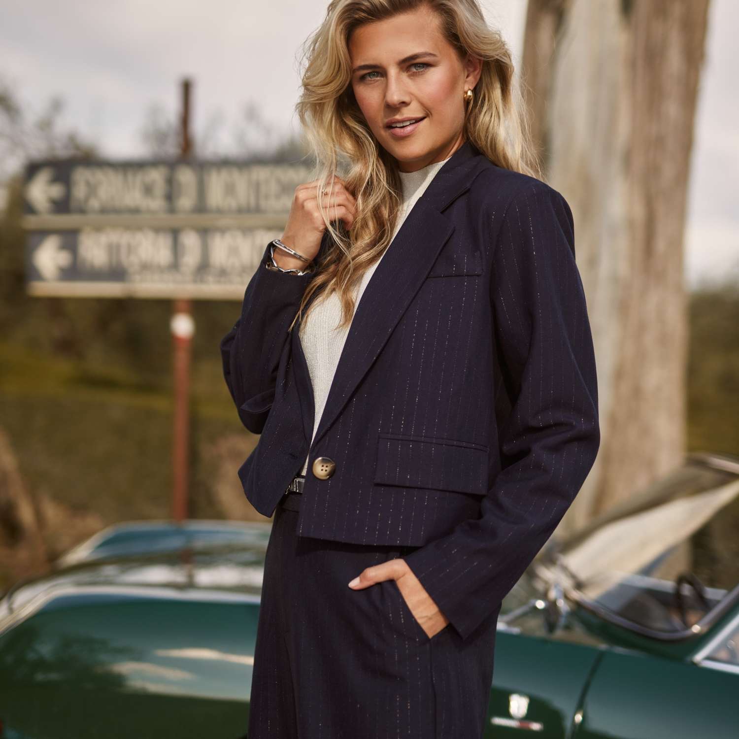 De Dakar blazer in navy met zilveren strepen is een stijlvolle korte blazer die direct de aandacht trekt. Met zijn opvallende strepen voegt hij een vleugje glans toe aan je outfit. Deze blazer is perfect te combineren met de New York Pants Stripe voor een gecoördineerde en verfijnde look.