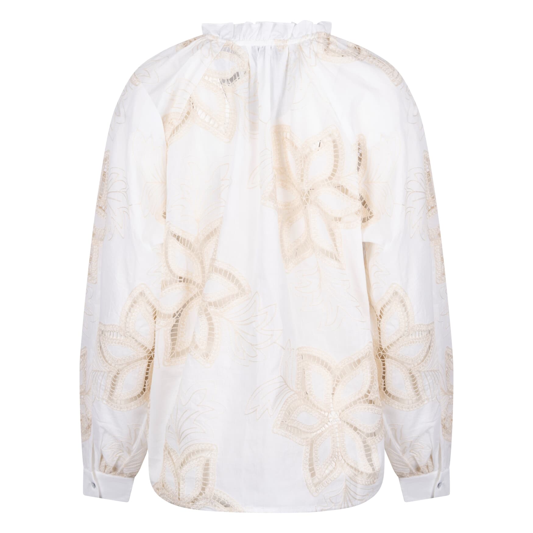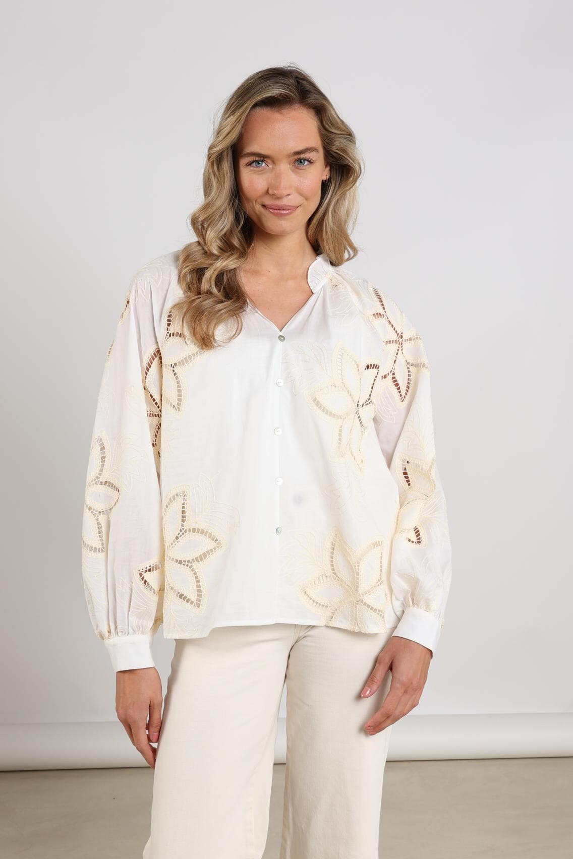 De Blouse Bridget Embroidery van Nukus is een stijlvolle blouse met een opstaande kraag en ronde hals. De lange mouwen eindigen in manchetten met knopen. Het geblokte patroon en de losse pasvorm maken het geschikt voor nette gelegenheden, terwijl de knopen zorgen voor een klassieke sluiting.