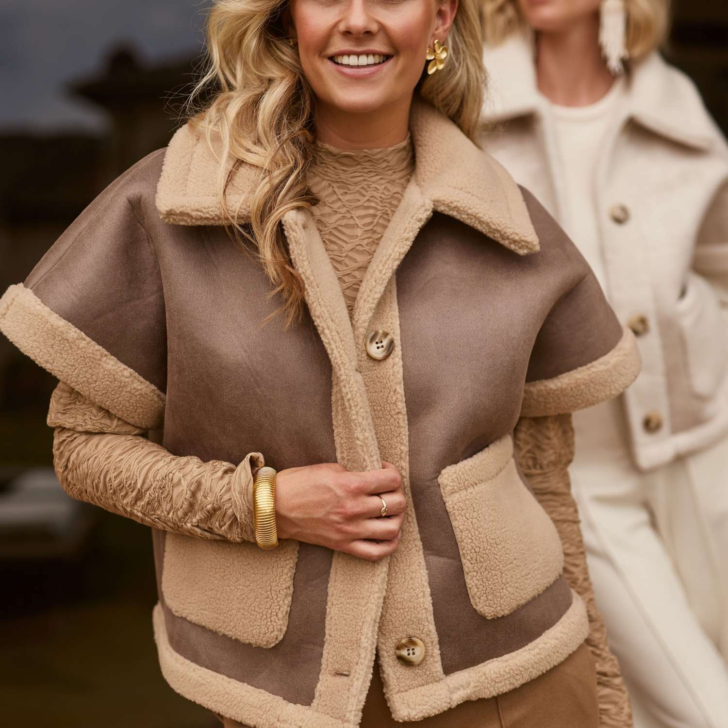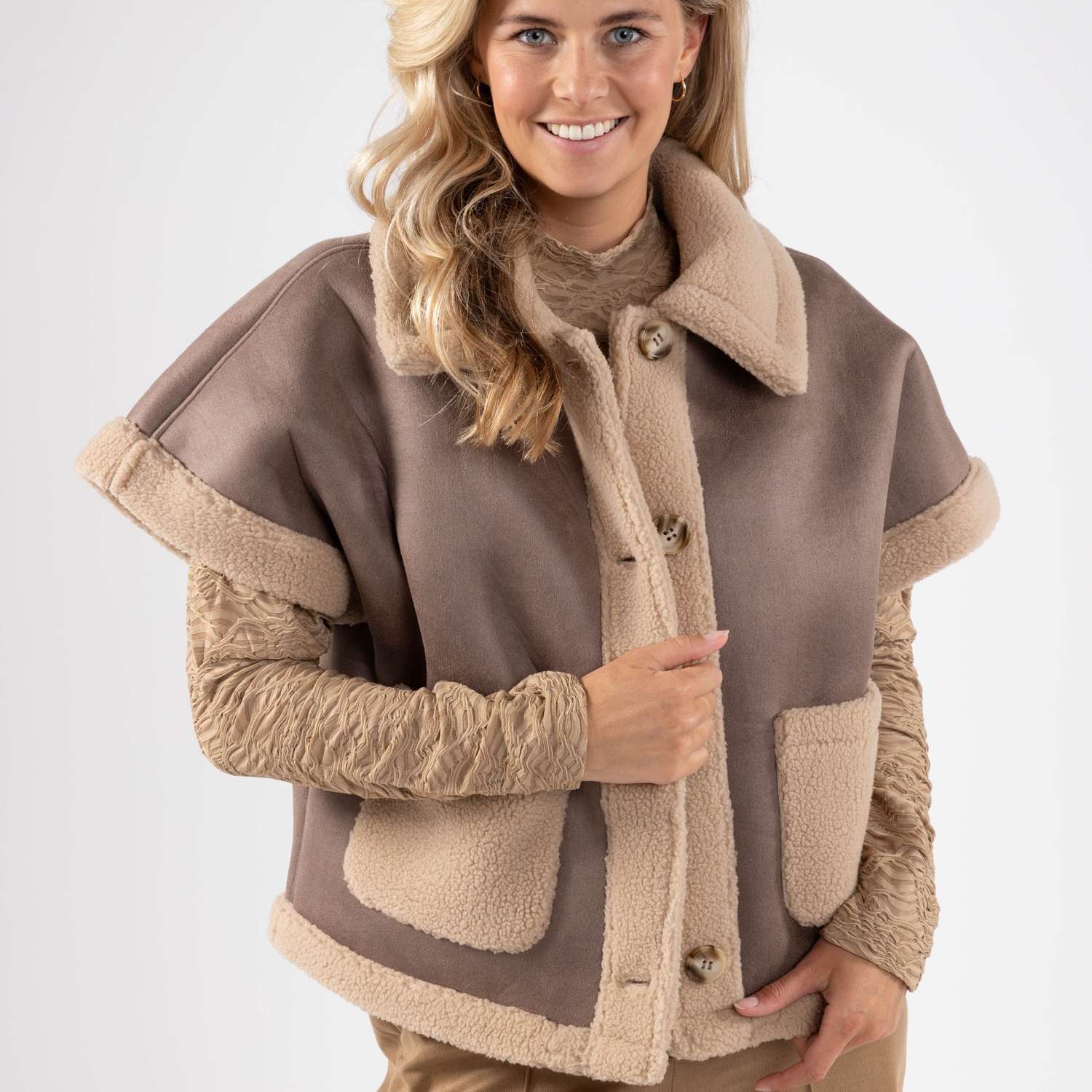 Het Athena gilet heeft een zachte teddy binnenkant en een leerlook buitenkant. De teddy stof komt overal subtiel terug bij de zakken, kraag, knoopsluiting en mouwen.