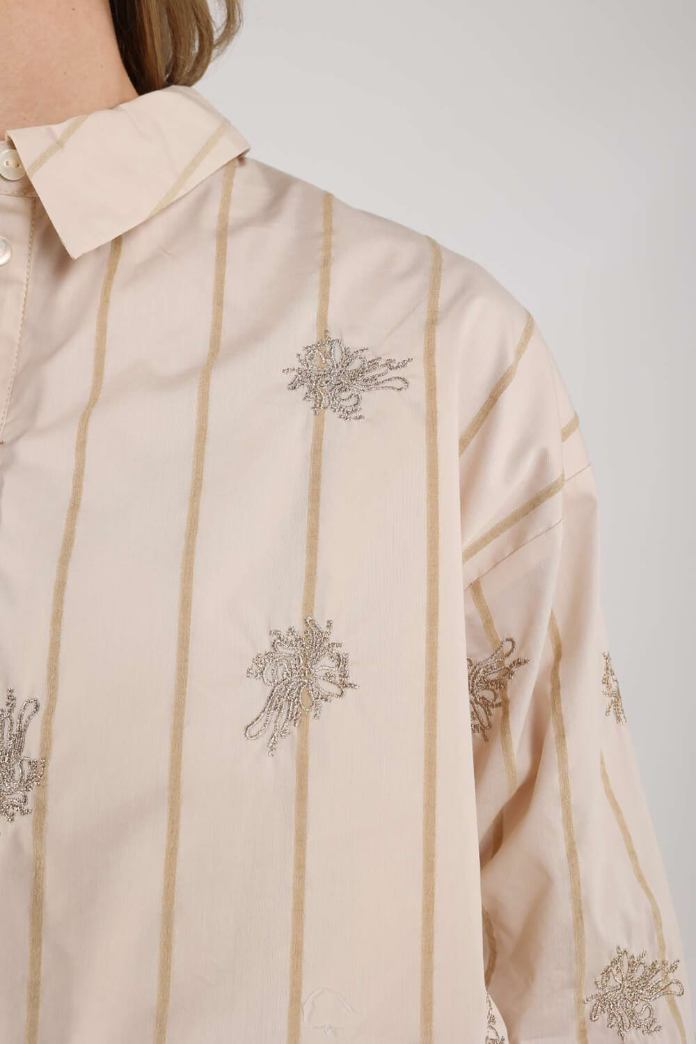 De Lara Blouse Embroidery van Nukus is een casual blouse met een button down kraag en een losse pasvorm. De blouse heeft lange mouwen met manchetten, zakken op de voorzijde, een bloemen- en streeppatroon, en is ideaal voor zowel nette als casual gelegenheden.
