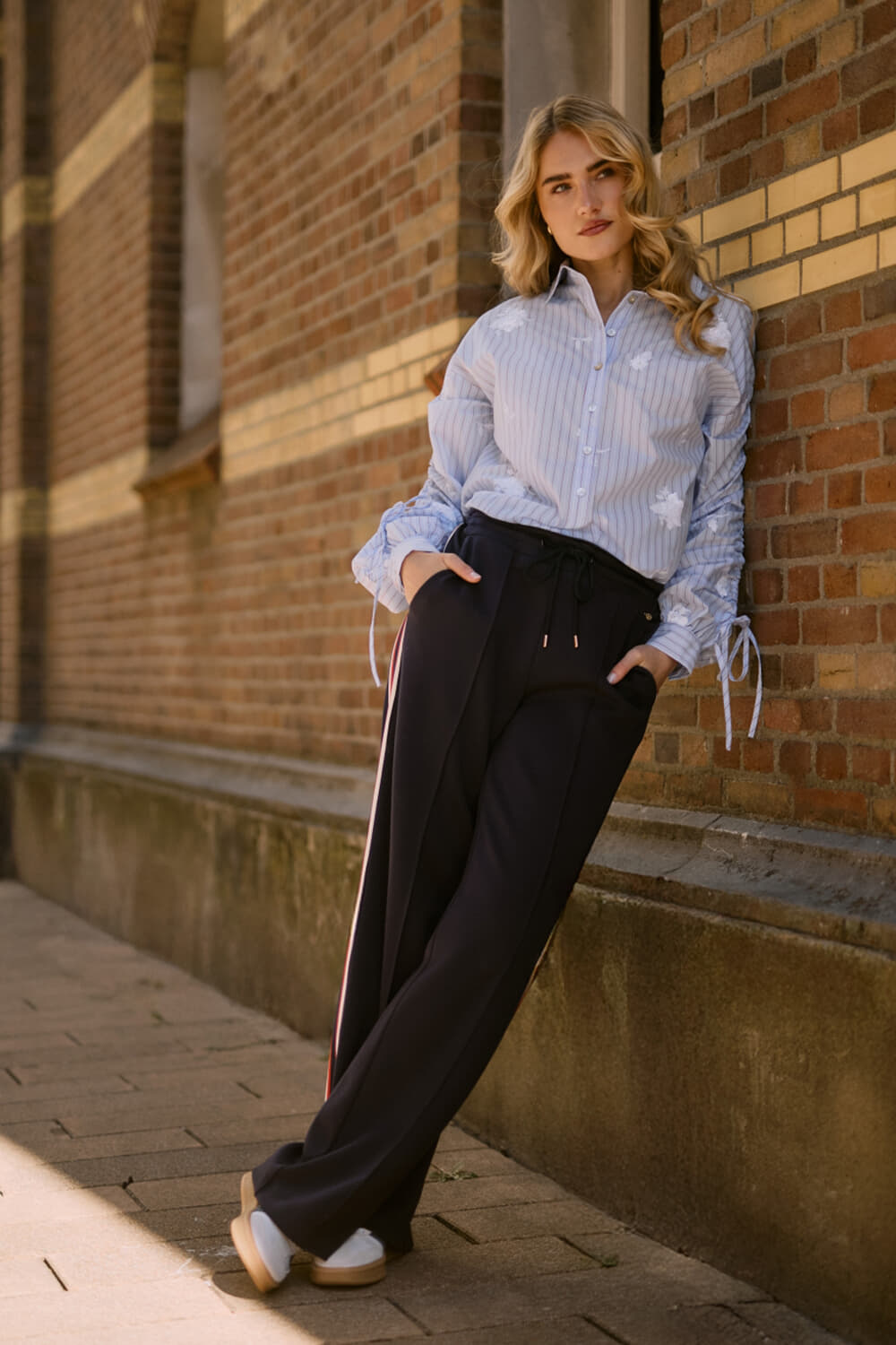 Pantalon Nora van Nukus is een casual dames pantalon met rechte pijpen en een opvallend streep patroon langs de zijkanten. De broek heeft een comfortabele koordsluiting, ideaal voor een ontspannen dag. Voeg een vleugje stijl toe aan elke gelegenheid met deze veelzijdige keuze.