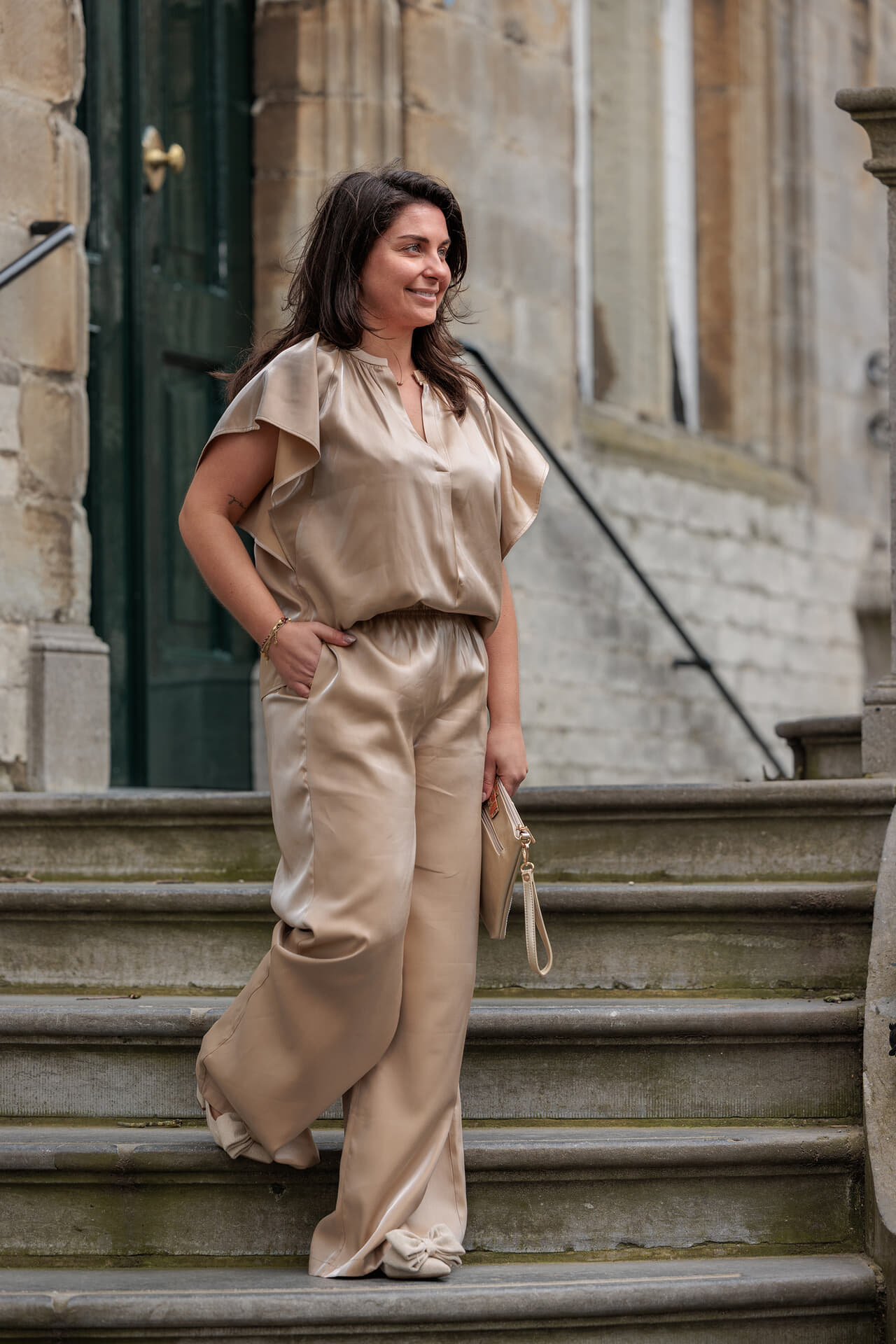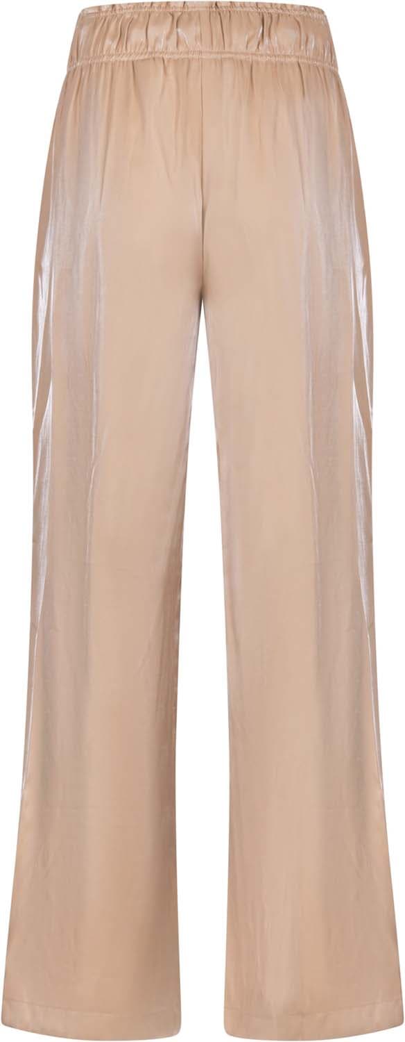 Pantalon Rubi Shiny van Nukus is een pantalon met wijde pijpen in een effen, glanzende stof. De elastische taille schuift makkelijk aan en zit prettig. Voorzakken geven ruimte voor kleine essentials. Combineer met een eenvoudige top en hakken voor een verzorgde uitstraling.