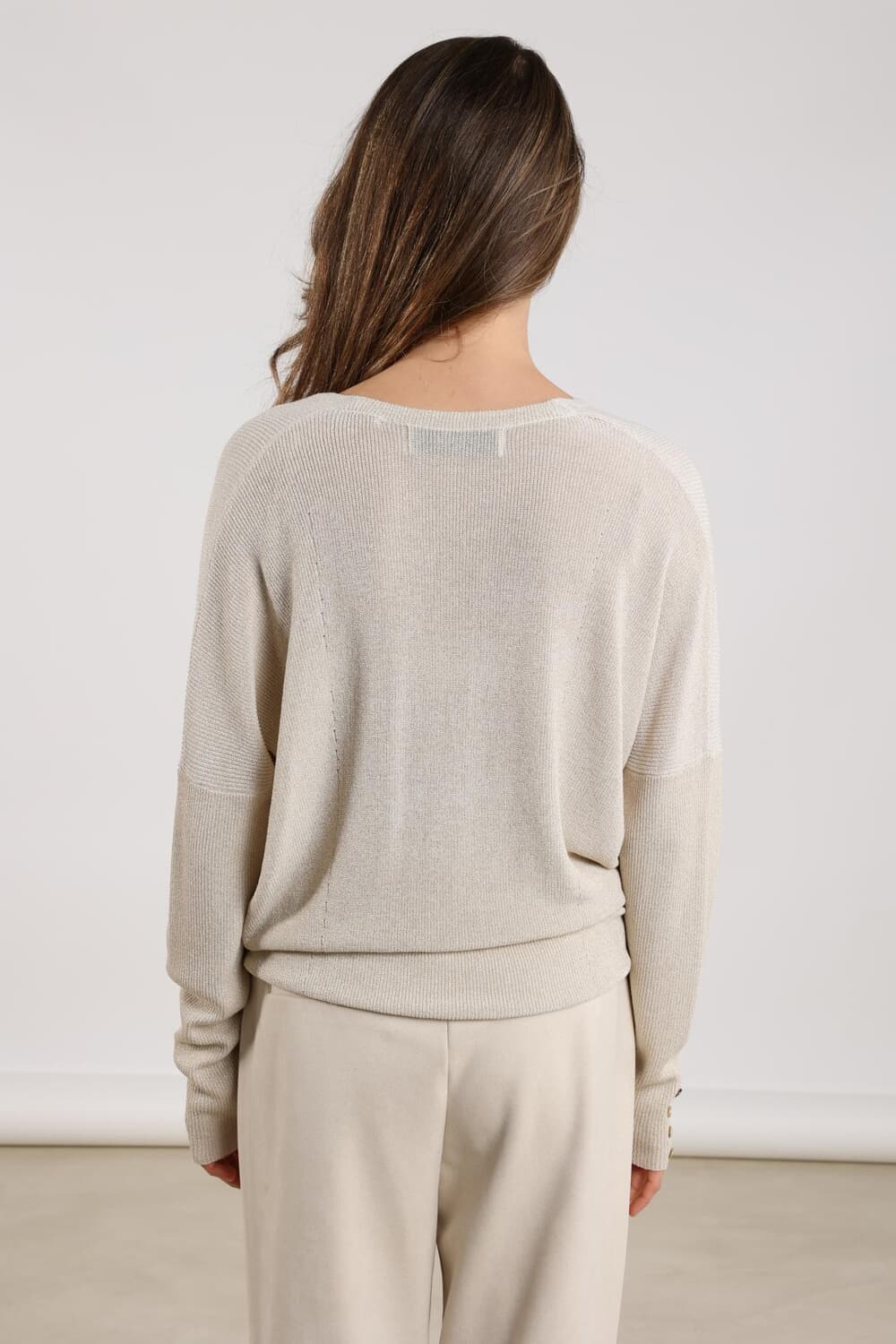Pullover Rosalie lurex van Nukus is een stijlvolle casual dames trui met lange mouwen en manchetknopen. De lichte, elegante stof en subtiele glans geven een modieuze uitstraling, perfect voor elke gelegenheid. Ideaal voor wie op zoek is naar comfort en stijl.