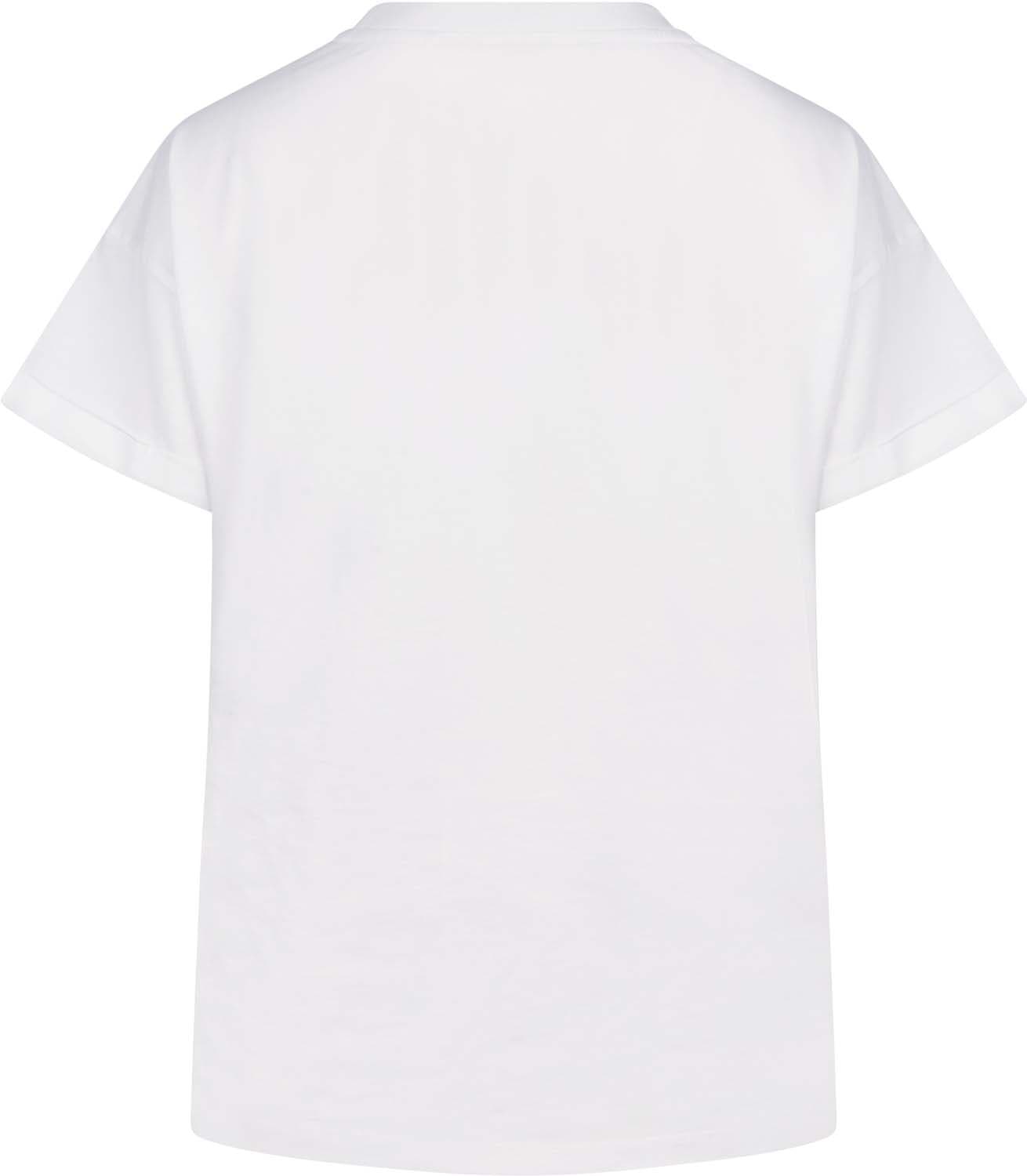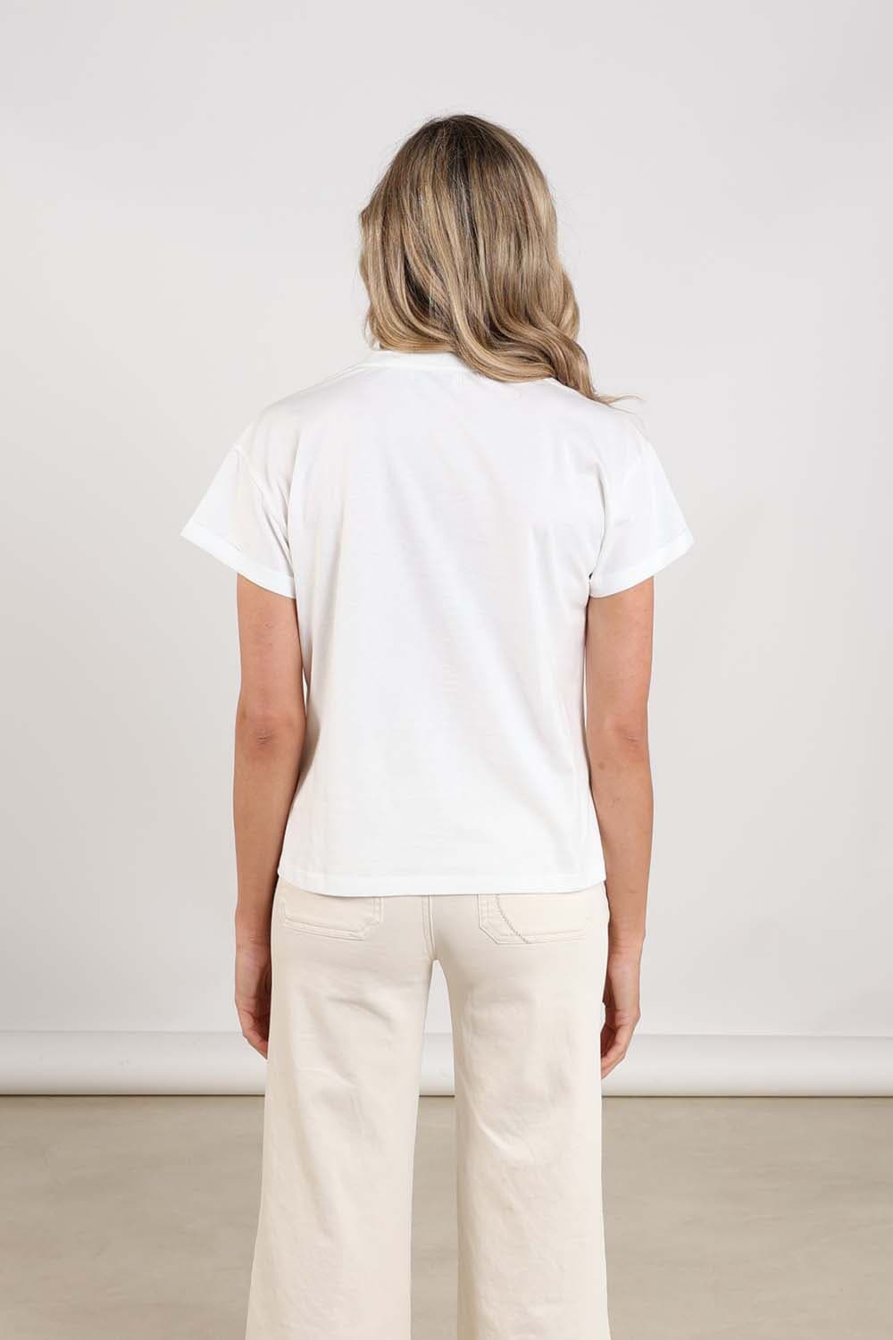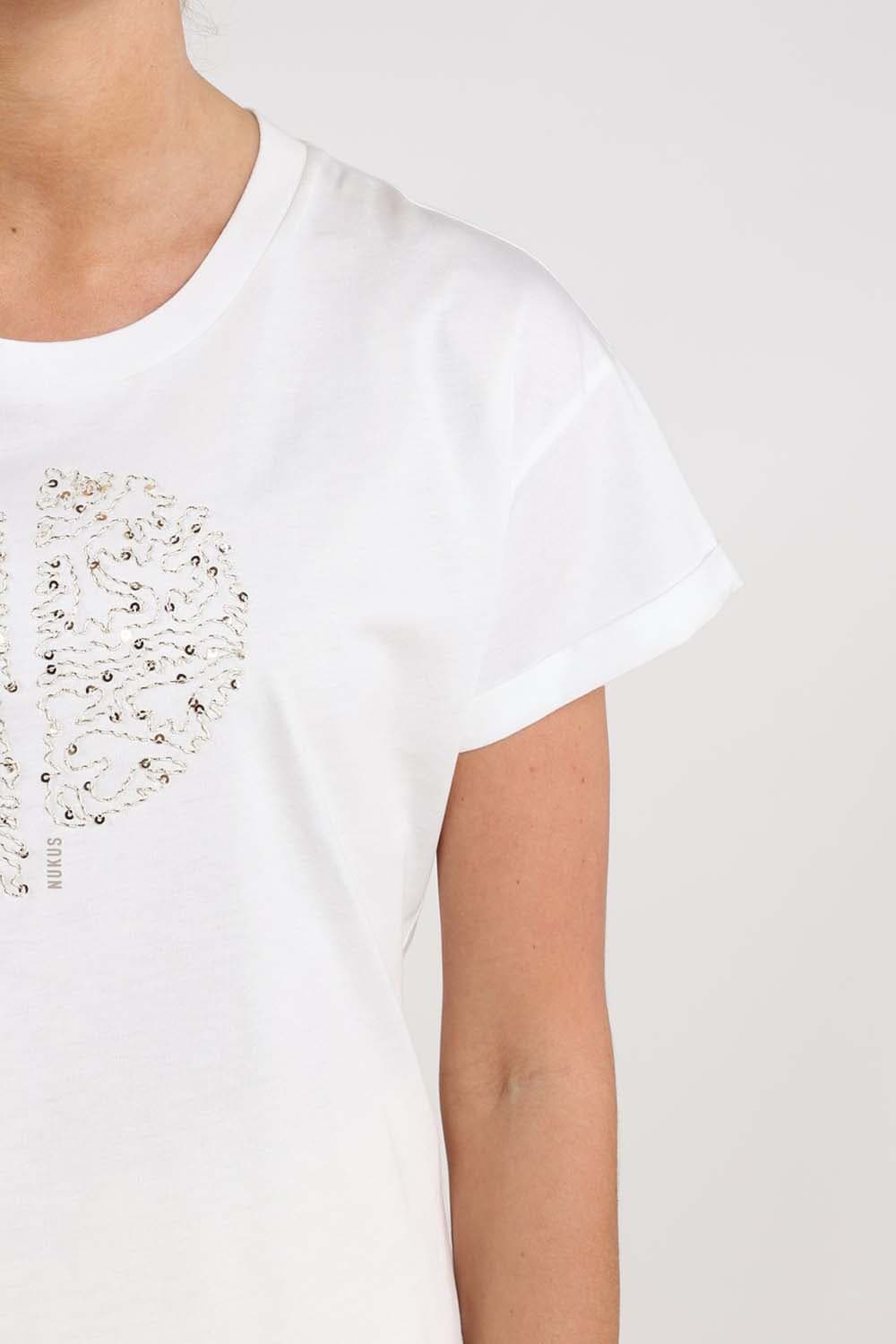 Riuka t-shirt van Nukus heeft een ronde hals, korte mouwen en een casual, feminine uitstraling. De grafische print op de borst is afgewerkt met glanzende details voor extra textuur. De rechte pasvorm draagt prettig en combineert makkelijk met een jeans of nette broek.