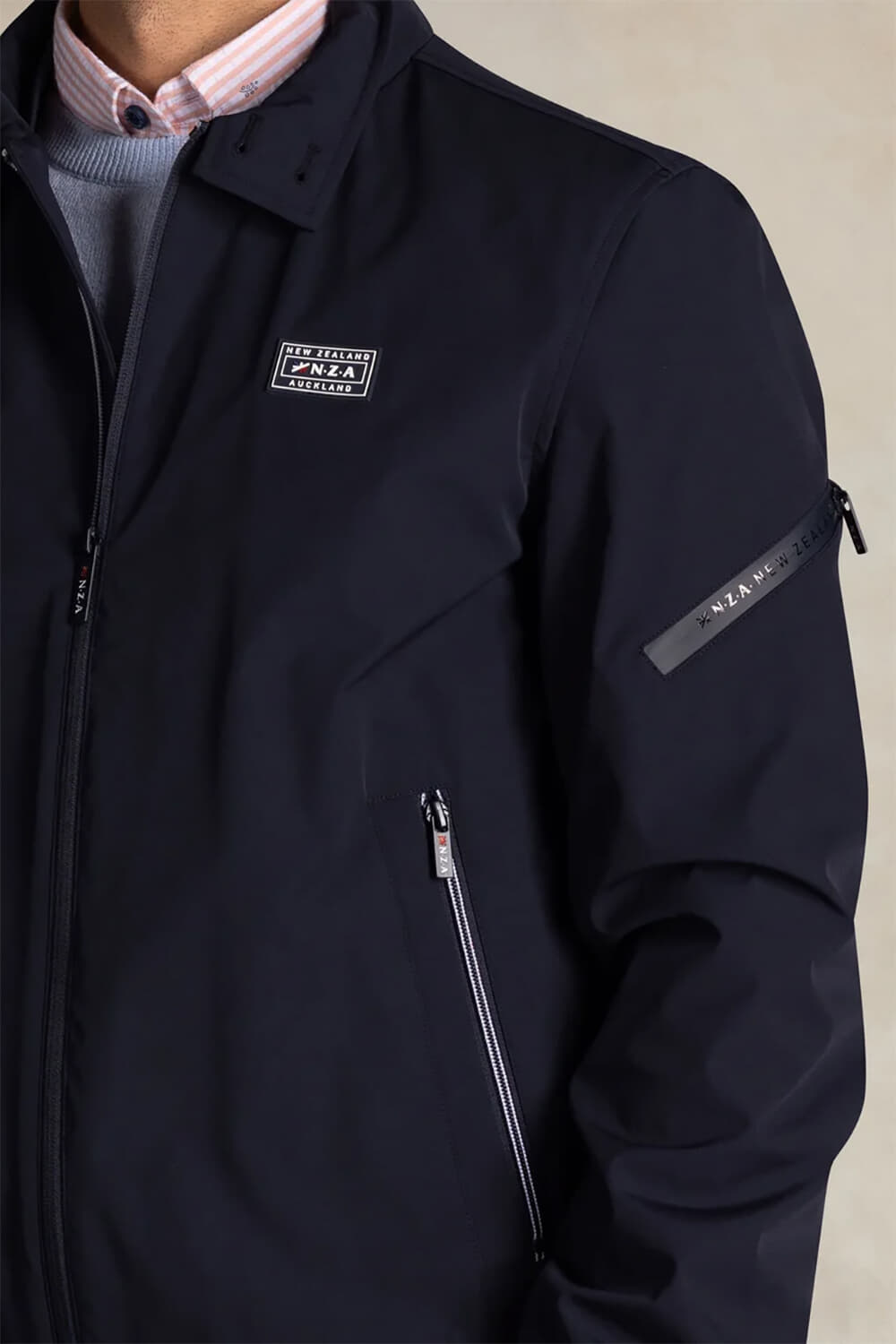 De jas van Nza is een casual heren jas met een opstaande kraag en comfortabele pasvorm. Deze softshell heeft zakken op de voorzijde, lange mouwen met ribgebreide boorden, en een handige ritssluiting. Perfect voor een modieuze en functionele look.