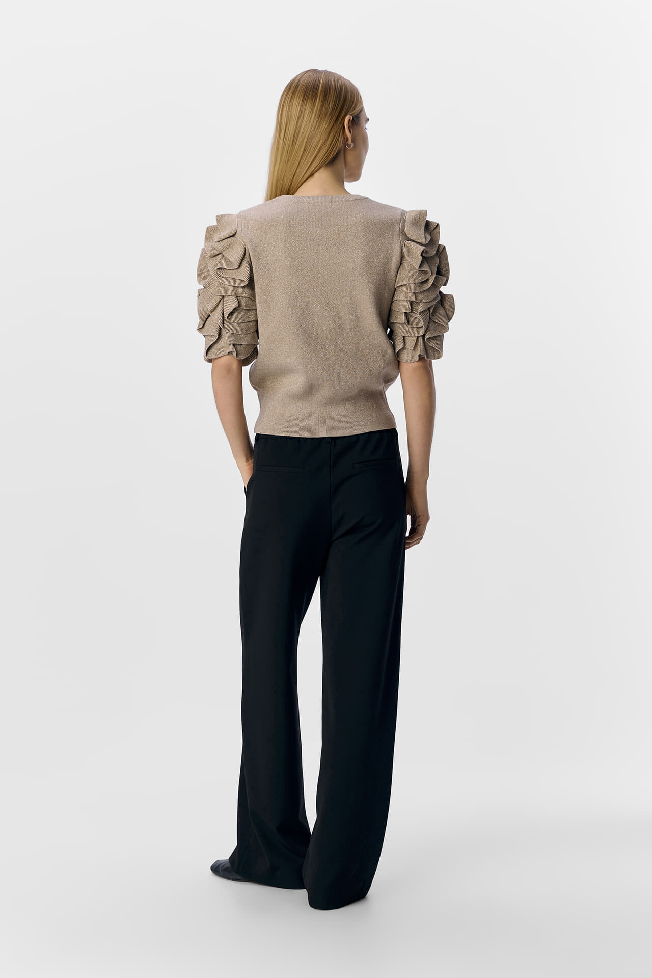 Pullover Diandra van Object is een gebreide trui met ronde hals, regular pasvorm en effen design. De mouwen vallen kort en zijn afgewerkt met opvallende ruches voor extra volume. De subtiele glans geeft een verzorgde uitstraling. Combineer met een pantalon of rok voor een nette set.