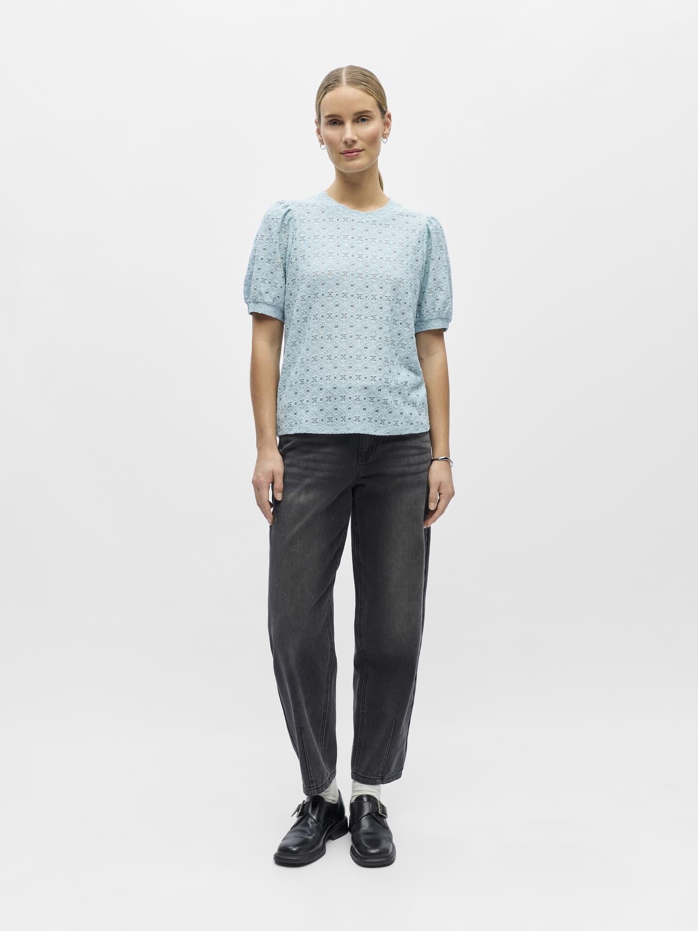 De Top Laila van Object is een elegante dames top korte mouw met een ronde hals en een regular pasvorm. Gemaakt van een luchtige stof met gaatjespatroon, biedt deze top een vrouwelijke uitstraling. Perfect voor een stijlvolle, casual look.