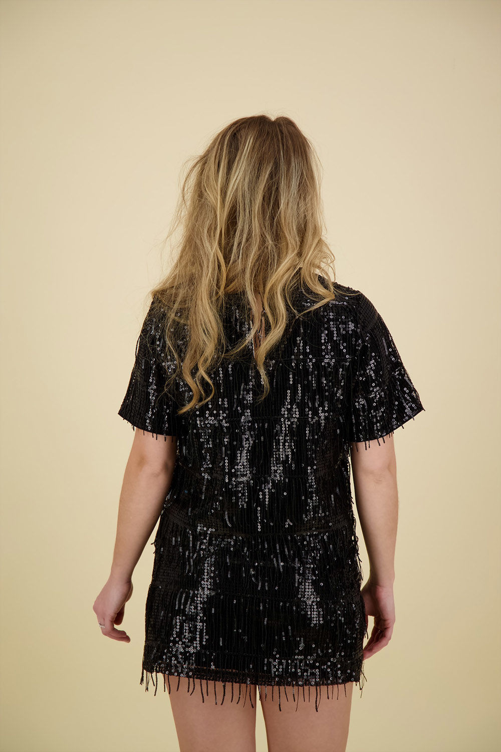 De Object Top Tella is een stijlvolle pailettentop met korte mouwen, ideaal voor feestelijke gelegenheden. Deze top maakt deel uit van een set en heeft een ronde hals en franjes langs de boord, wat zorgt voor een speelse en elegante uitstraling. De regular fit biedt een comfortabele pasvorm die perfect is voor verschillende gelegenheden.
