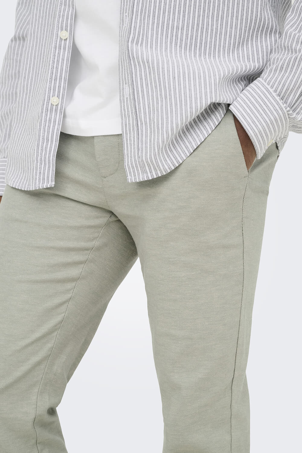Broek Mark Tappered Linnen van Only & Sons is een chino met slimfit en normale taille. De effen stof oogt rustig en netjes. Met knoop- en ritssluiting, zijzakken, voor- en achterzakken. Draag casual met sneakers of combineer met overhemd en nette schoenen.