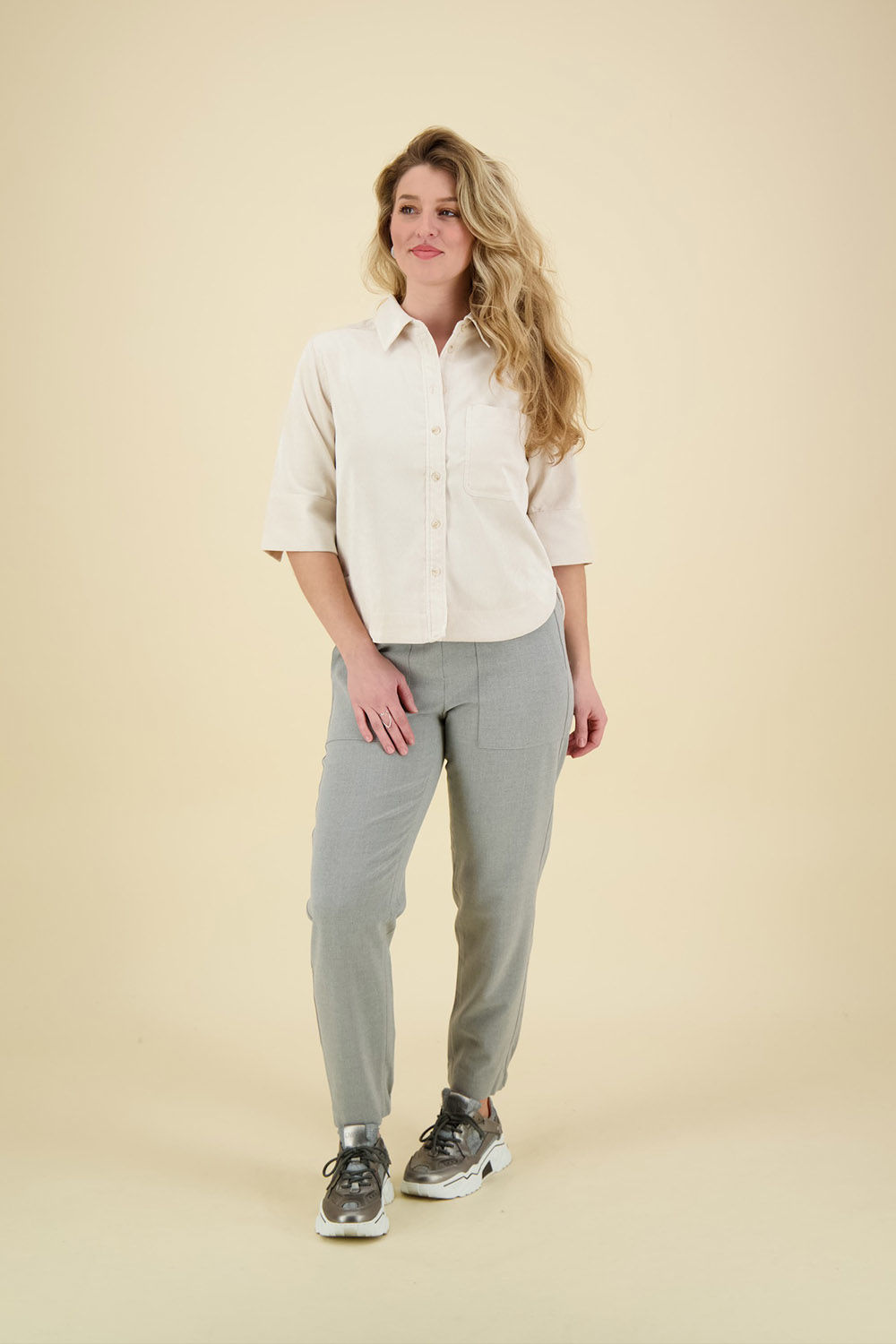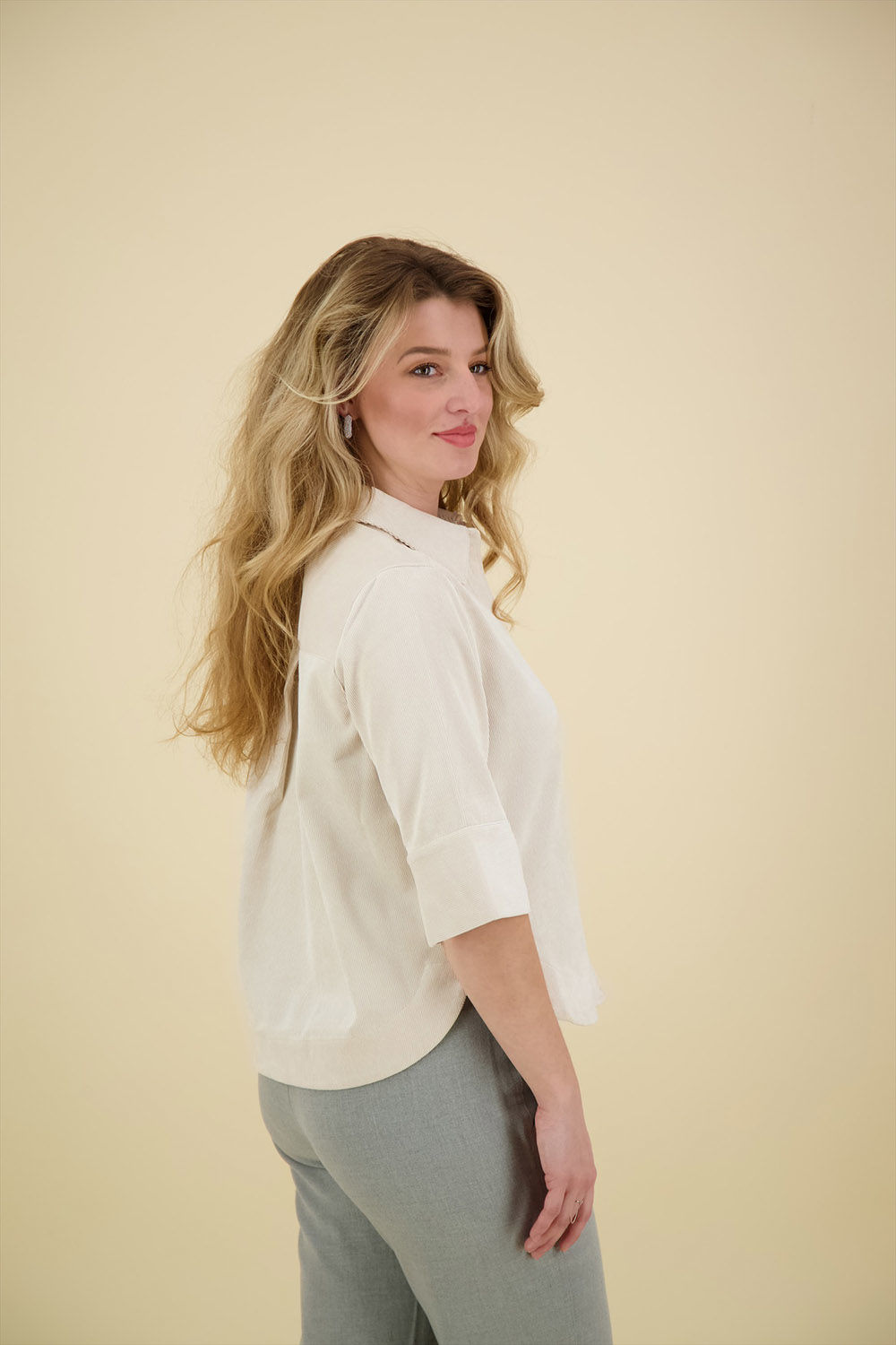 De fijne geribbelde structuur en het fluweelachtige oppervlak zorgen voor een uniek en zacht handvat, en de elastische stof biedt extra draagcomfort. Details zoals de grote borstzak, plooien aan de achterkant, afgeronde zoom, lange knoopsluiting, split in de manchetten en een juk in de rug maken het ontwerp compleet. Met een ruglengte van ongeveer 59 cm voor maat 36, is deze blouse perfect voor verschillende gelegenheden.