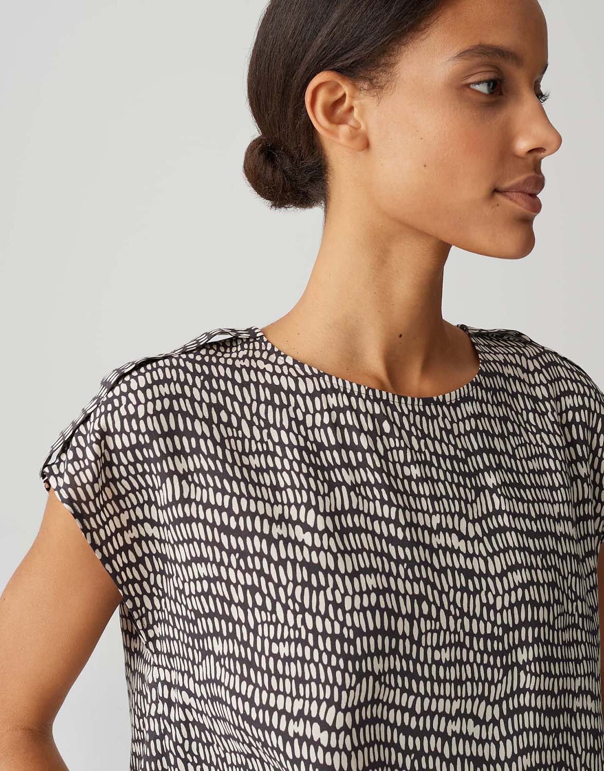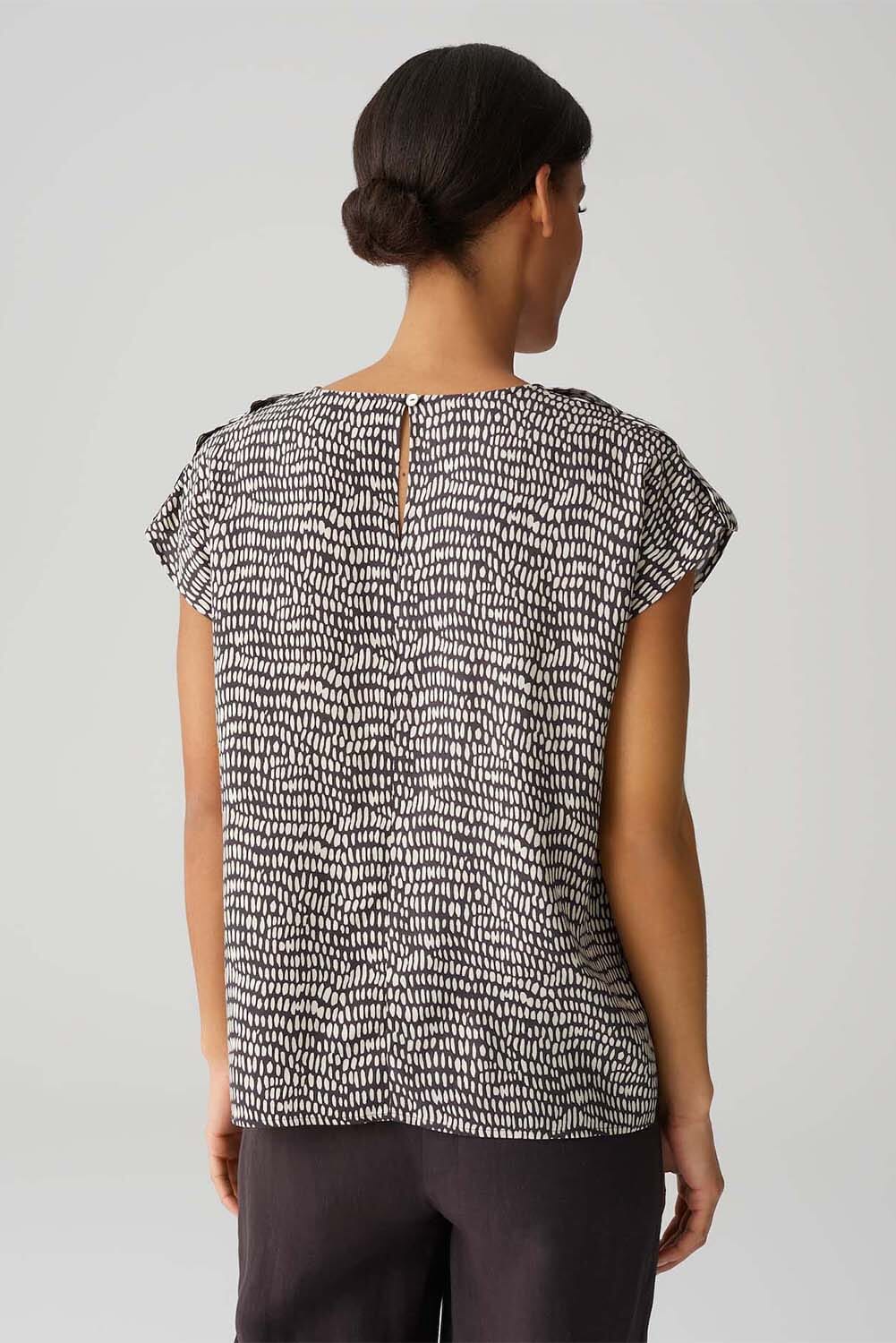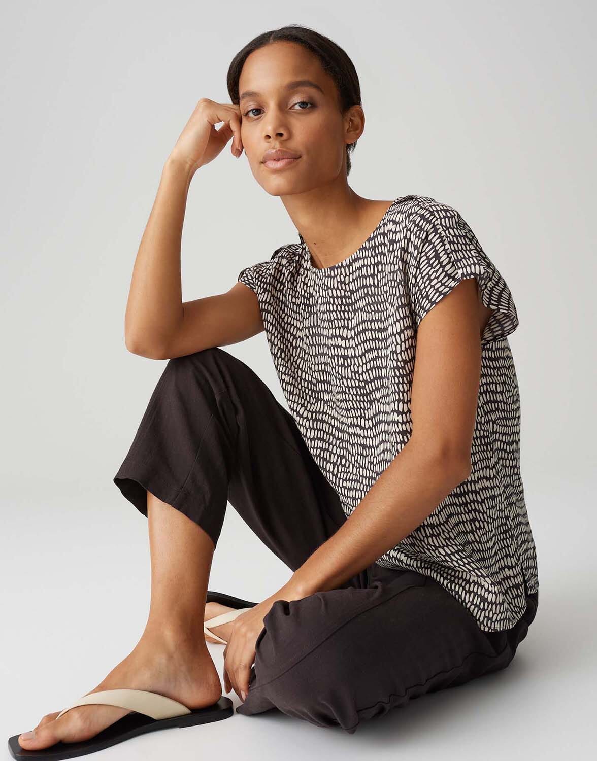 De blouse van Opus combineert een casual stijl met een grafisch patroon, ideaal voor dagelijks gebruik. De blouse heeft een ronde halslijn en korte mouwen, wat zorgt voor een luchtige en comfortabele pasvorm. Perfect voor een ontspannen, modieuze uitstraling.