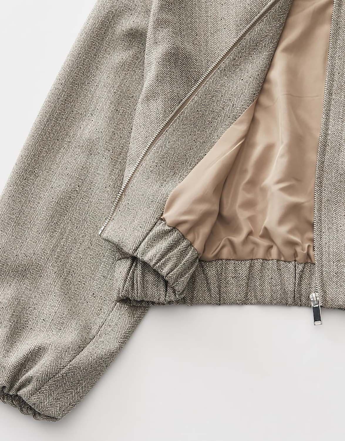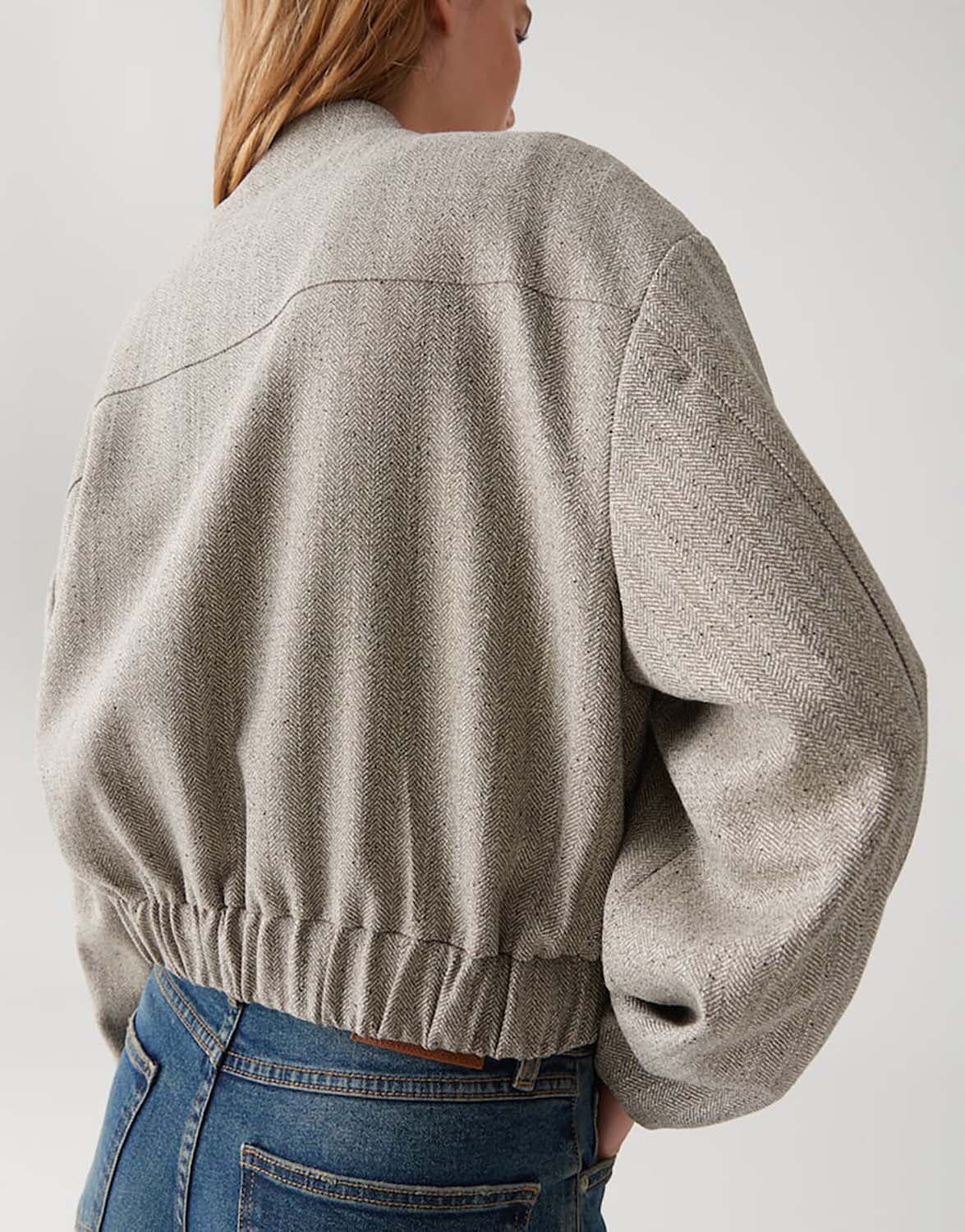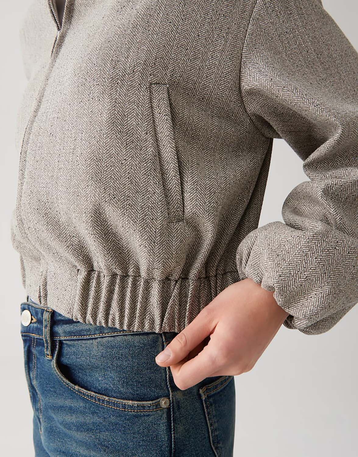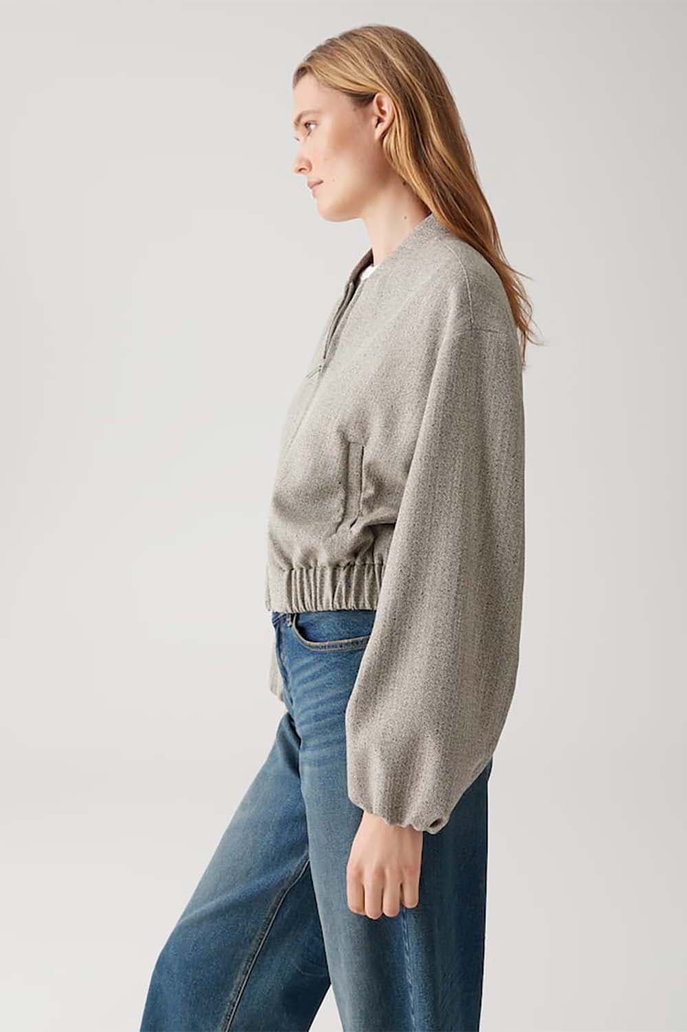 Blouson Jalea herringbone in visgraatmotief van Opus is een casual bomberjas met een opstaande kraag en lange mouwen. De elastische manchetten en rits zorgen voor een comfortabele pasvorm. Ideaal voor stijlvolle looks binnen de categorie dames blazers.