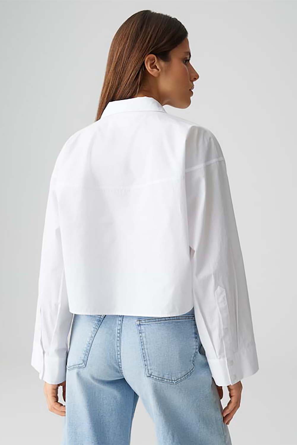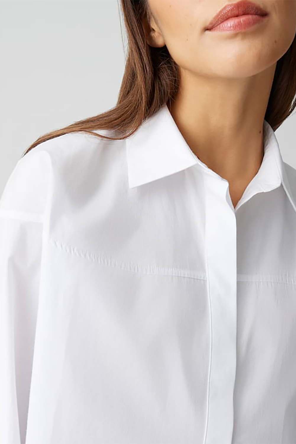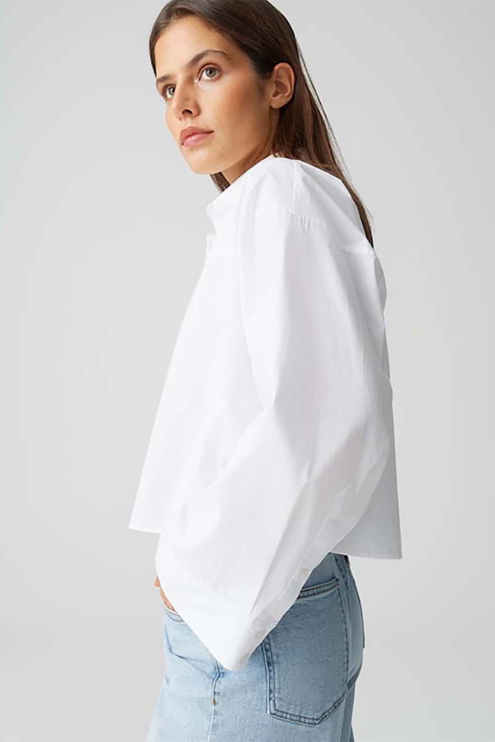 Klassieke overhemdblouse ontmoet modieuze innovatie: de ongewone snit met een afgerond juk en boxy pasvorm transformeert de basic voor kantoor in een veelzijdig it-piece. Casual met denim of chic met een broek van wijde stof, een key piece voor creatieve looks die ver afstaan van de standaard kantooroutfit.