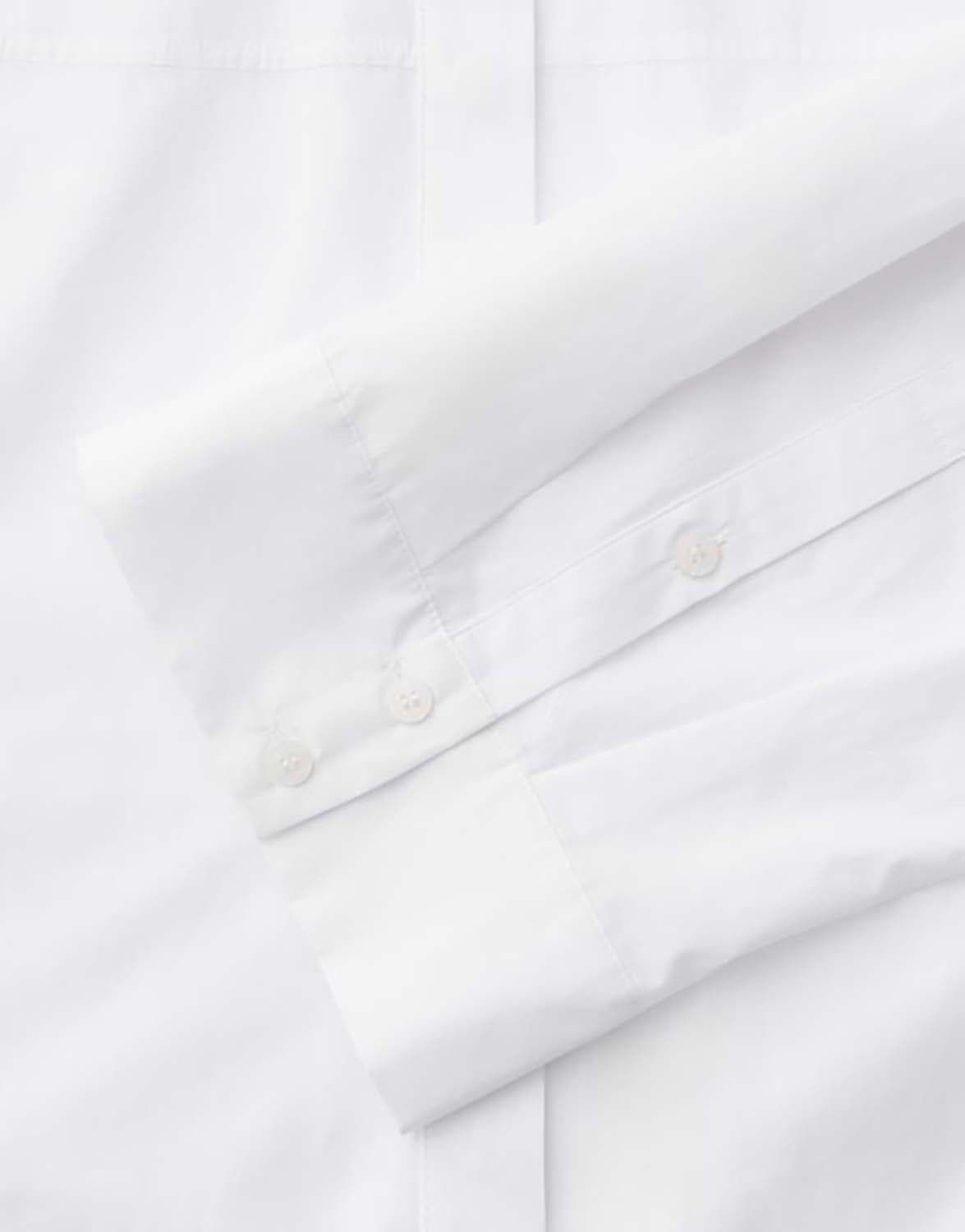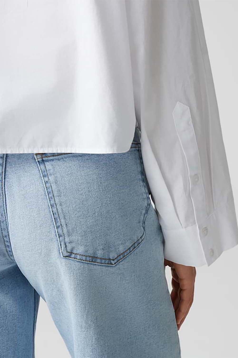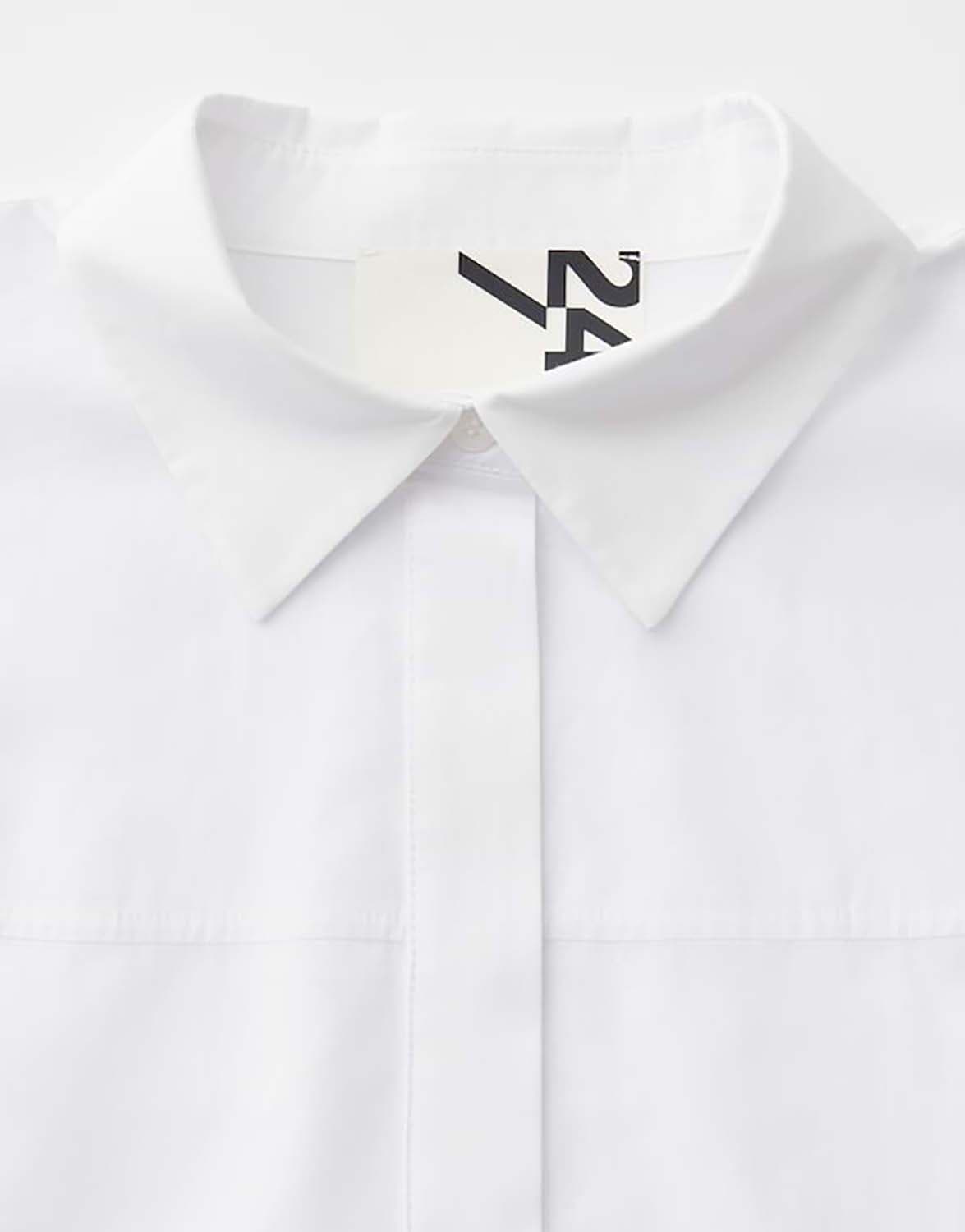 Klassieke overhemdblouse ontmoet modieuze innovatie: de ongewone snit met een afgerond juk en boxy pasvorm transformeert de basic voor kantoor in een veelzijdig it-piece. Casual met denim of chic met een broek van wijde stof, een key piece voor creatieve looks die ver afstaan van de standaard kantooroutfit.