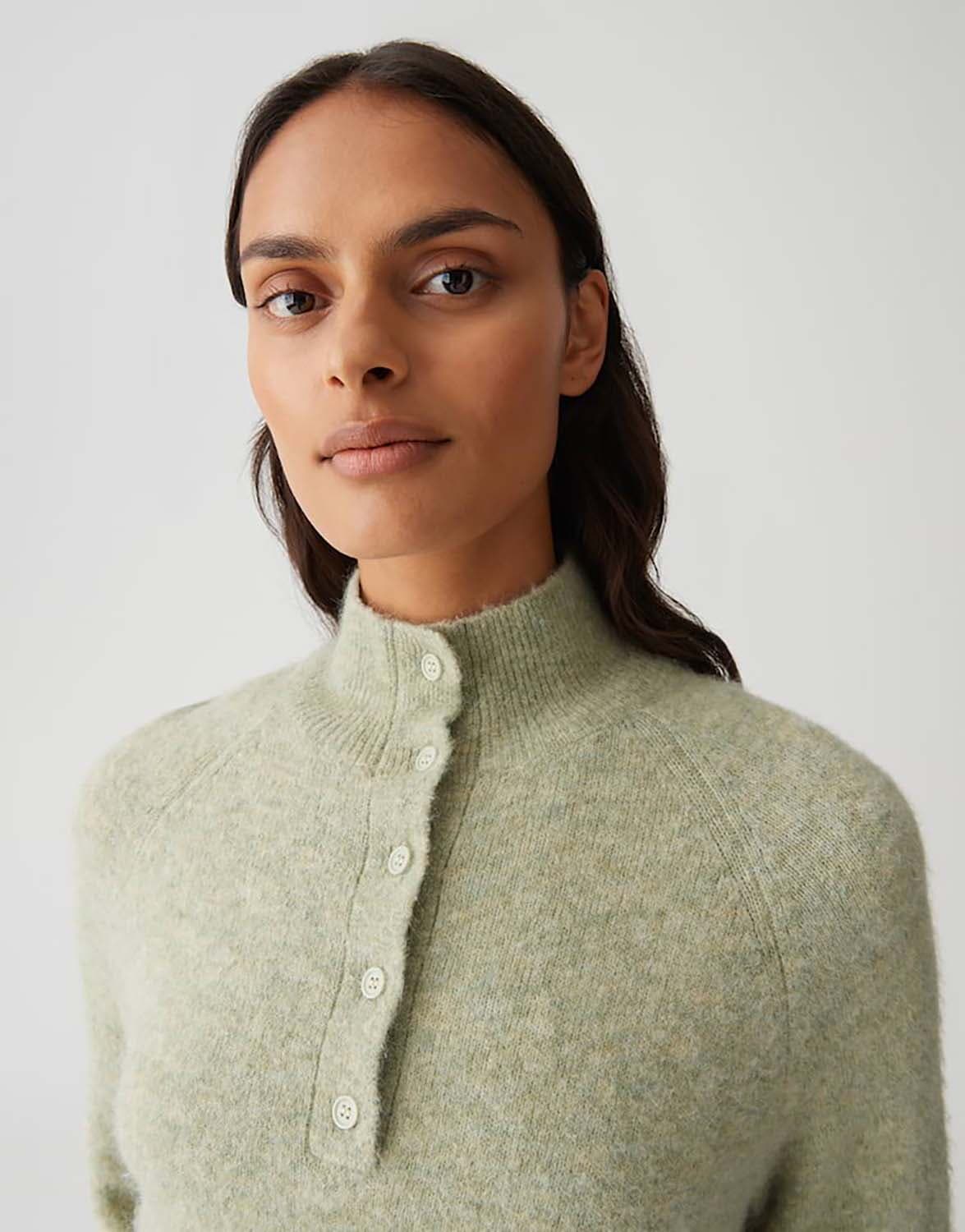 De Gebreide Trui Plutton van Opus is een stijlvolle trui in minimalistische stijl. Met een opstaande kraag, lange mouwen en een slanke pasvorm biedt deze effen trui comfort en warmte. De ribgebreide mouwboorden en knoopsluiting maken het geschikt voor casual gelegenheden.