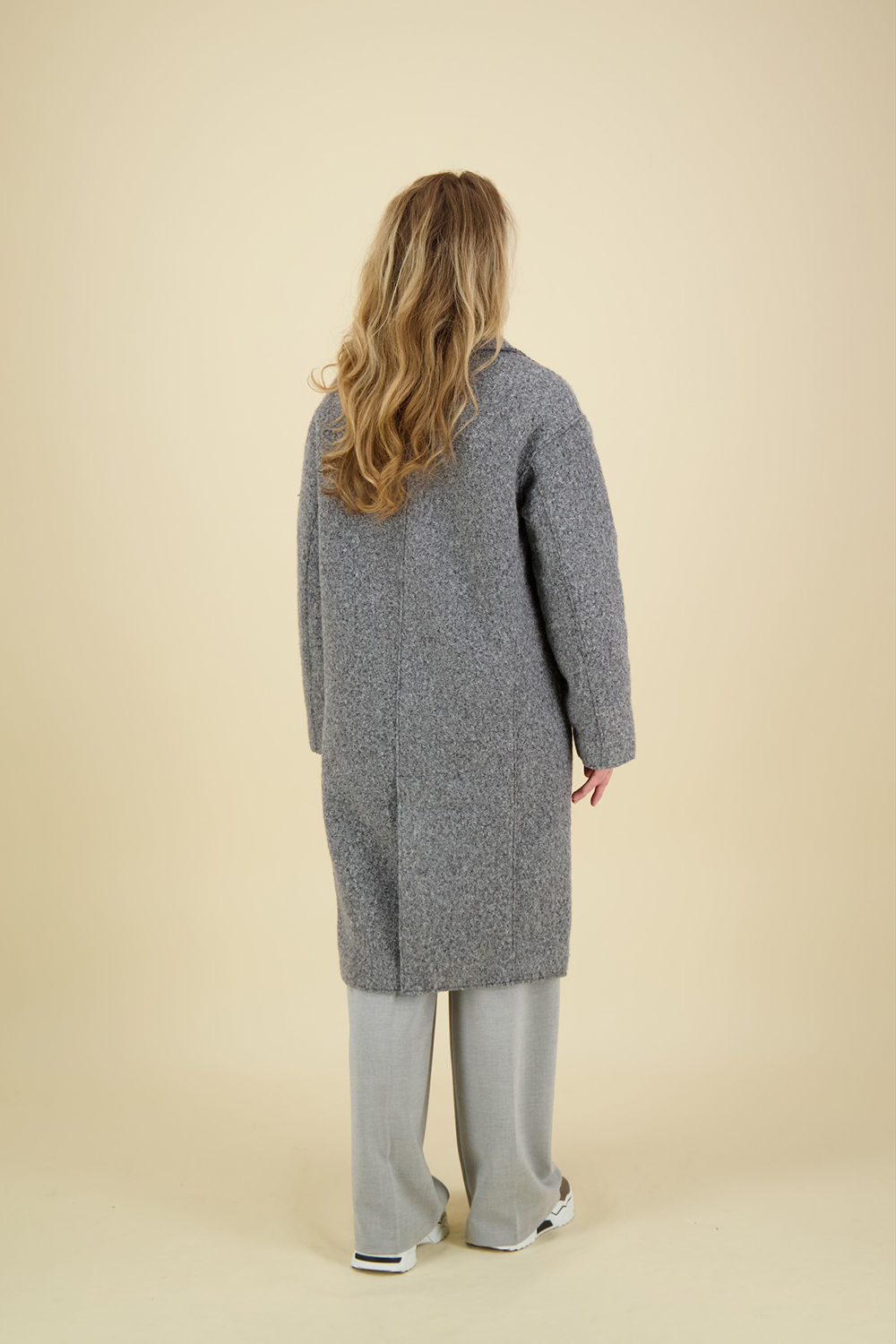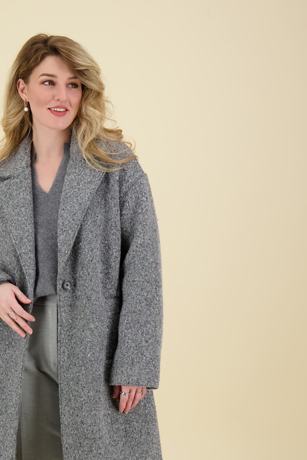 De Opus HANNIE oversize jas in bouclé-look is een klassieke jas die als een echt modehighlight geldt, dankzij de warme bouclé stof en het moeiteloze stylingeffect voor de herfst. De jas heeft een oversized pasvorm met een rechte snit en knielengte. Hij is voorzien van lange mouwen, een diepe V-hals, en een kapel kraag. Met een ruglengte van circa 106 cm voor maat 36, biedt de jas een comfortabele en warme keuze.
