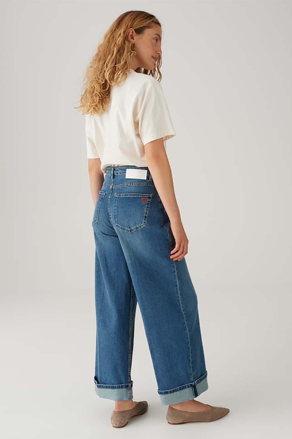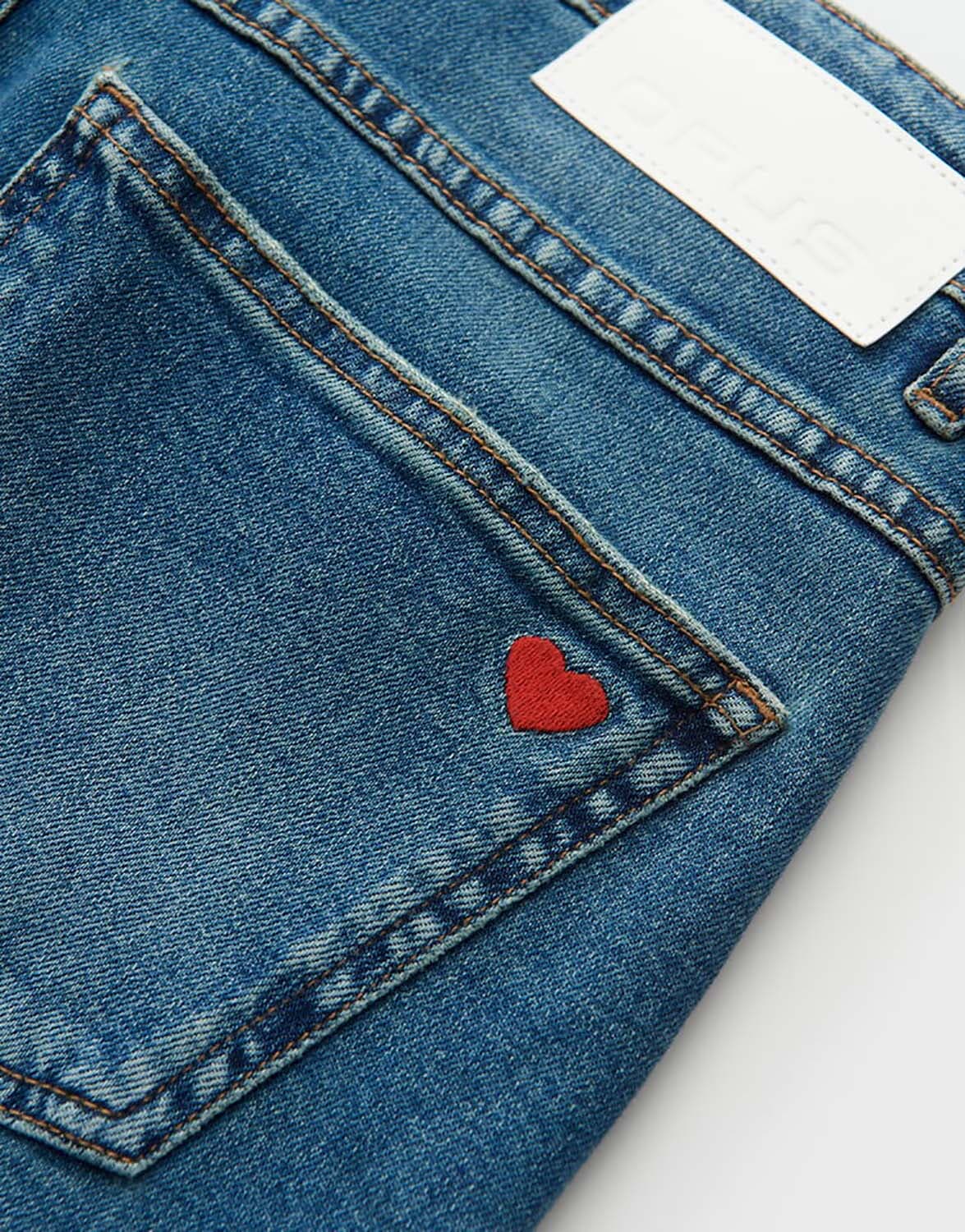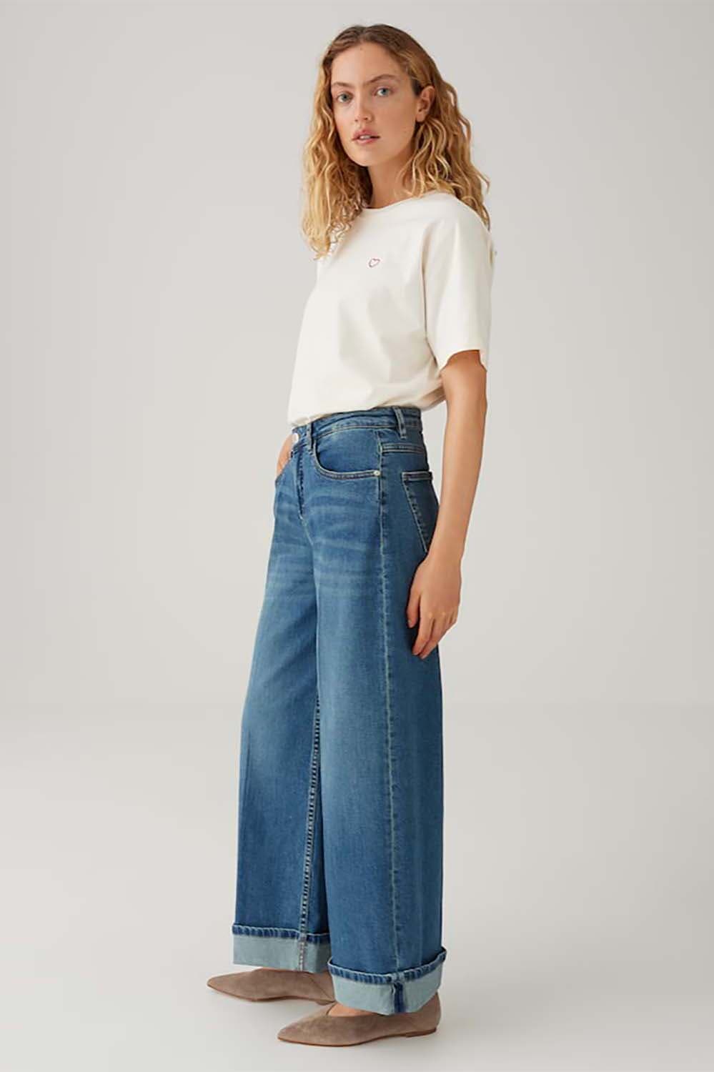 De denim met wijde pijpen, omgeslagen zoom en authentieke wassing geeft elke look een frisse lichtheid. Het subtiele hartjesborduursel, passend bij onze "Love Edition", vertelt over liefdevolle accenten die het alledaagse speciaal maken.