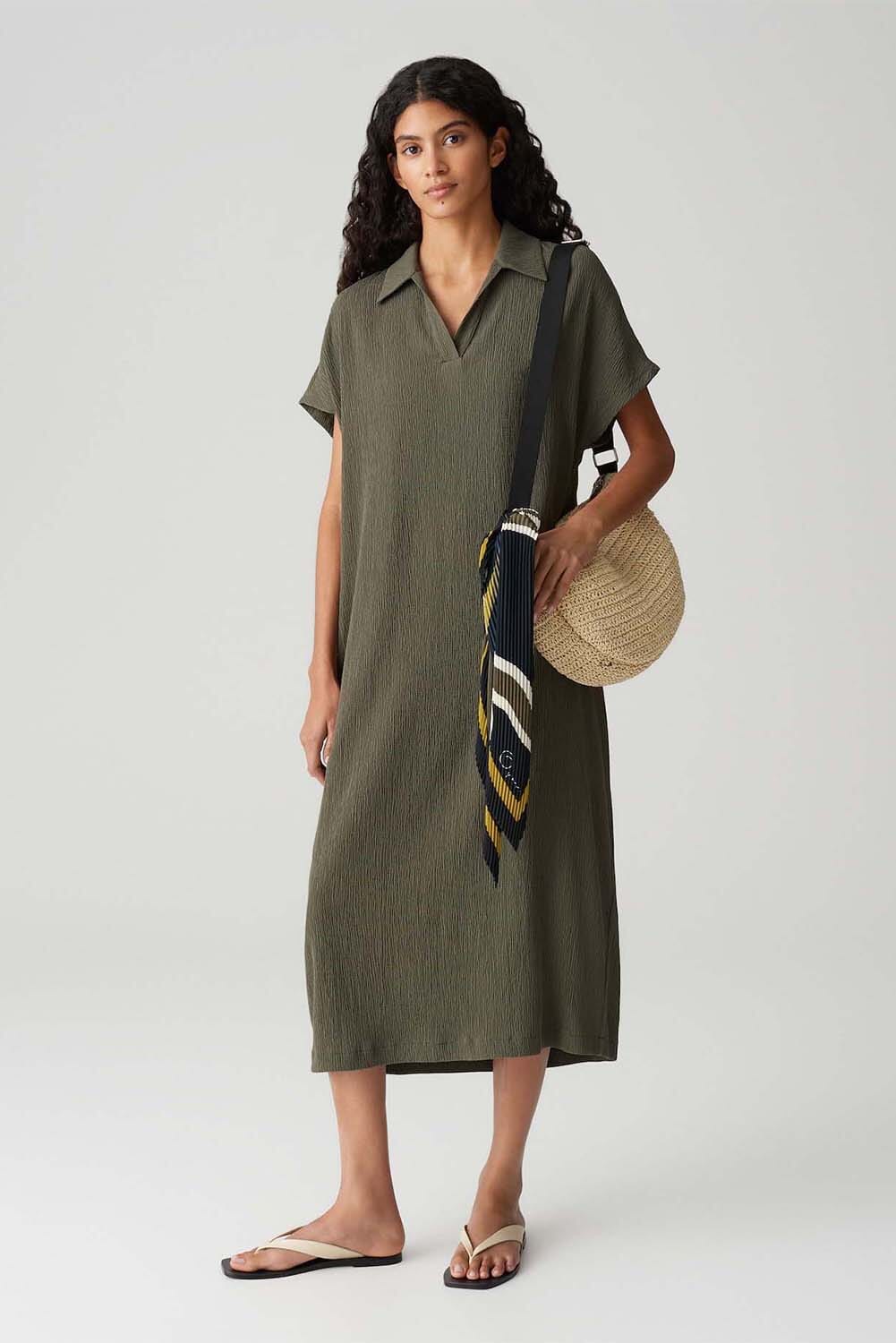 De jurk van Opus is een stijlvolle damesjurk met een minimalistisch ontwerp. De spreidkraag en V-hals zorgen voor een verfijnde uitstraling, terwijl de losse pasvorm en korte mouwen comfort bieden. Perfect voor diverse gelegenheden, met een elegante midi-lengte.