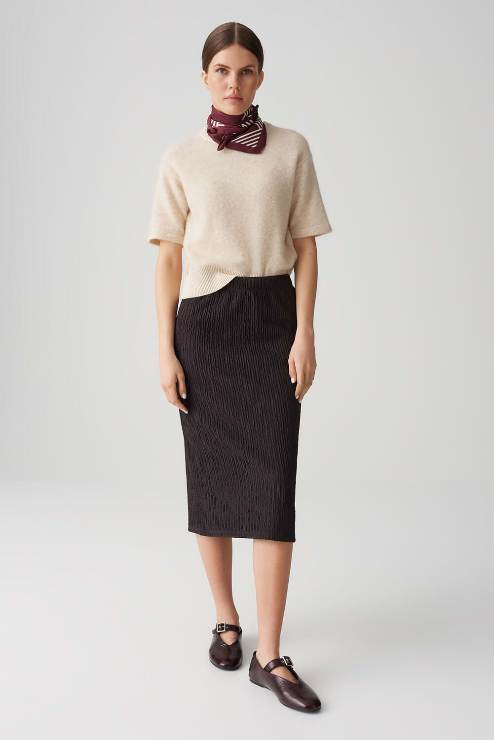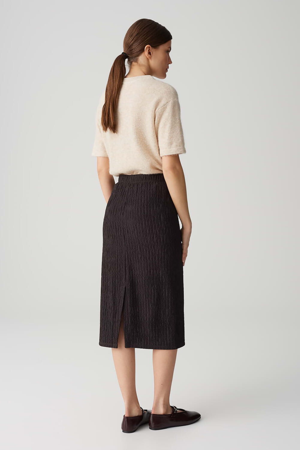 De Kokerrok Rilasa structured van Opus is een verfijnde toevoeging aan dames rokken. Met een elastische taille en slimfit pasvorm biedt deze effen midi-rok stijl en comfort. Het gestructureerde ontwerp voegt een vleugje elegantie toe, ideaal voor elke gelegenheid.